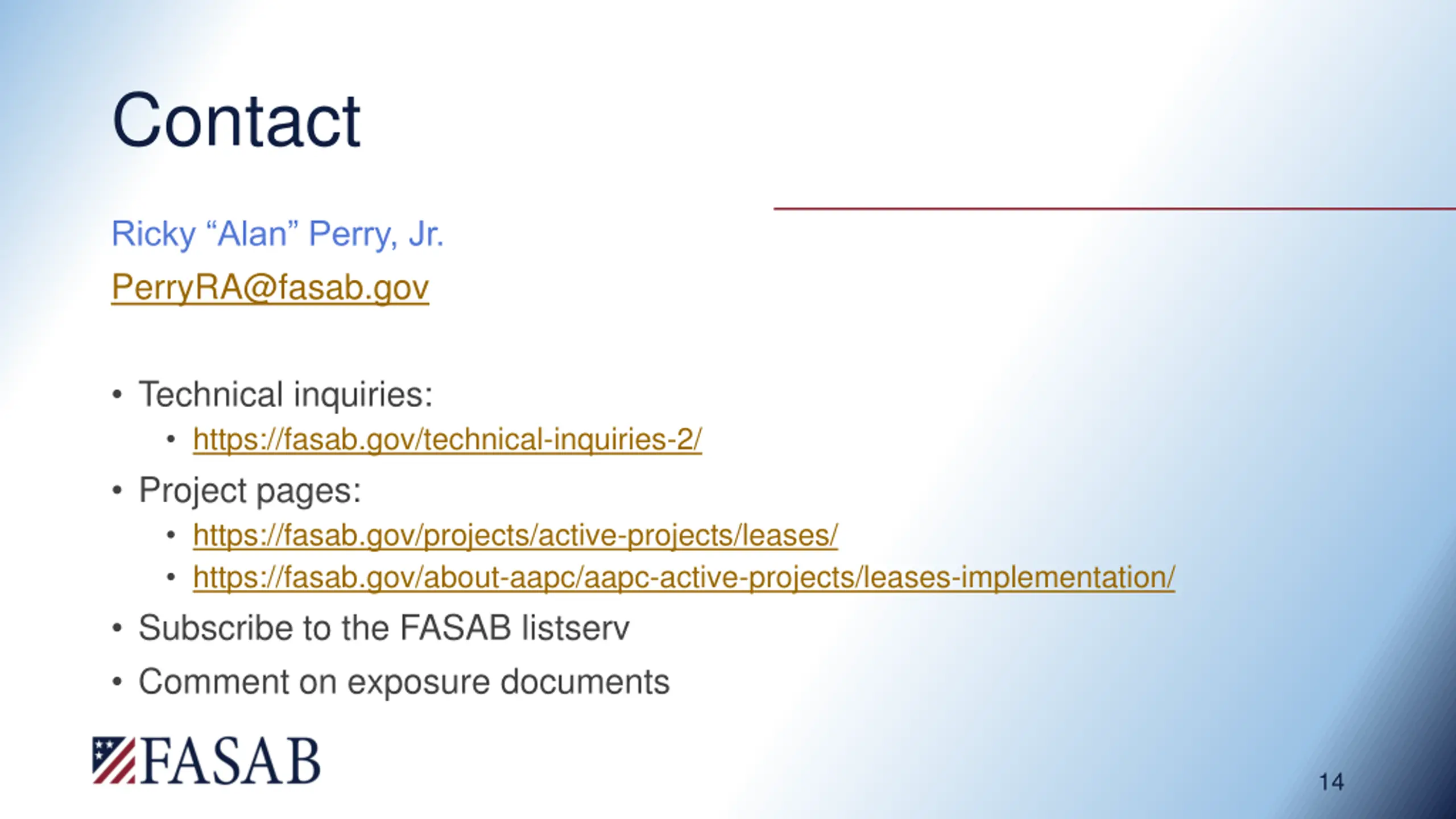 Contact Ricky Alan Perry, Jr. PerryRA@fasab.gov Technical inquiries: https://fasab.gov/technical-inquiries-2/ Project pages: https://fasab.gov/projects/active-projects/leases/ https://fasab.gov/about-aapc/aapc-active-projects/leases-implementation/ Subscribe to the FASAB listserv Comment on exposure documents 14