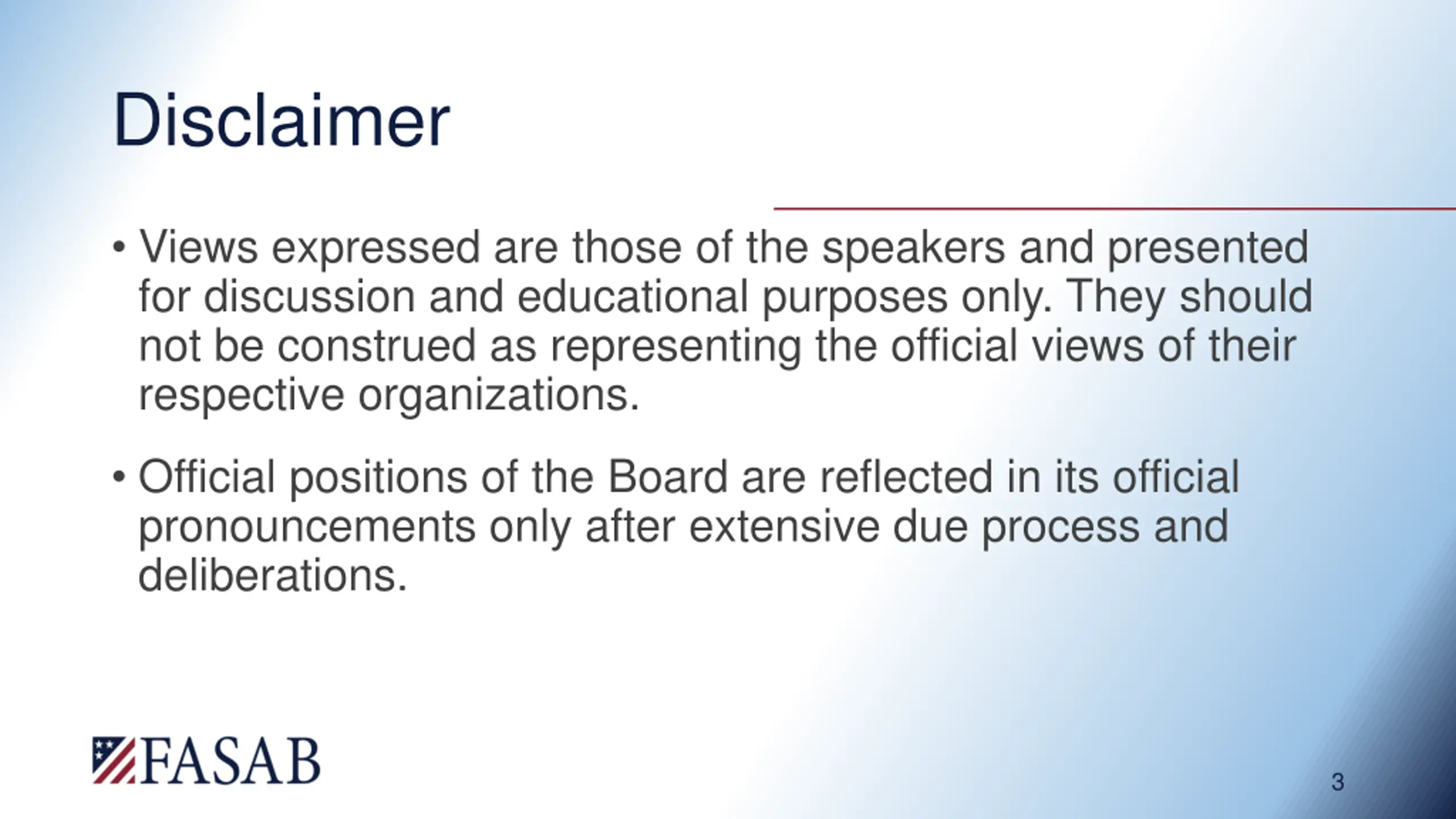 Disclaimer Views expressed are those of the speakers and presented for discussion and educational purposes only. They should not be construed as representing the official views of their respective organizations. Official positions of the Board are reflected in its official pronouncements only after extensive due process and deliberations. 3
