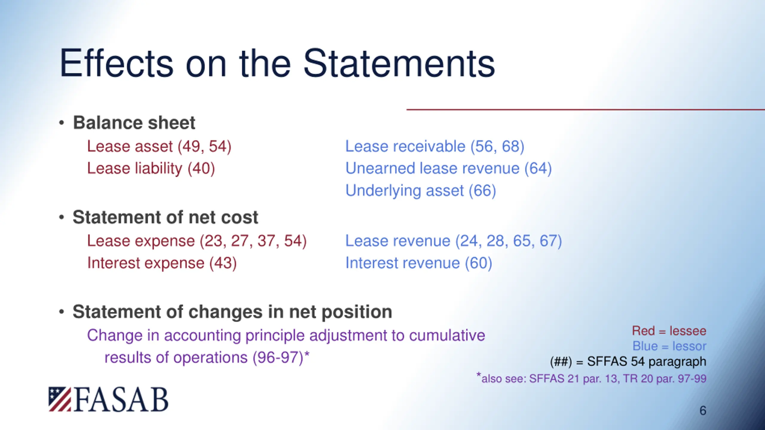 SFFAS 54 Big Picture Pre-54 54 Off Short-Term Leases Intragovernmental Leases Balance Sheet Operating Leases Bright-line rules resulting in off-balance-sheet financing On Lease Assets / Liabilities Lease Rec / Unearned Rev Balance Sheet Capital Leases 5