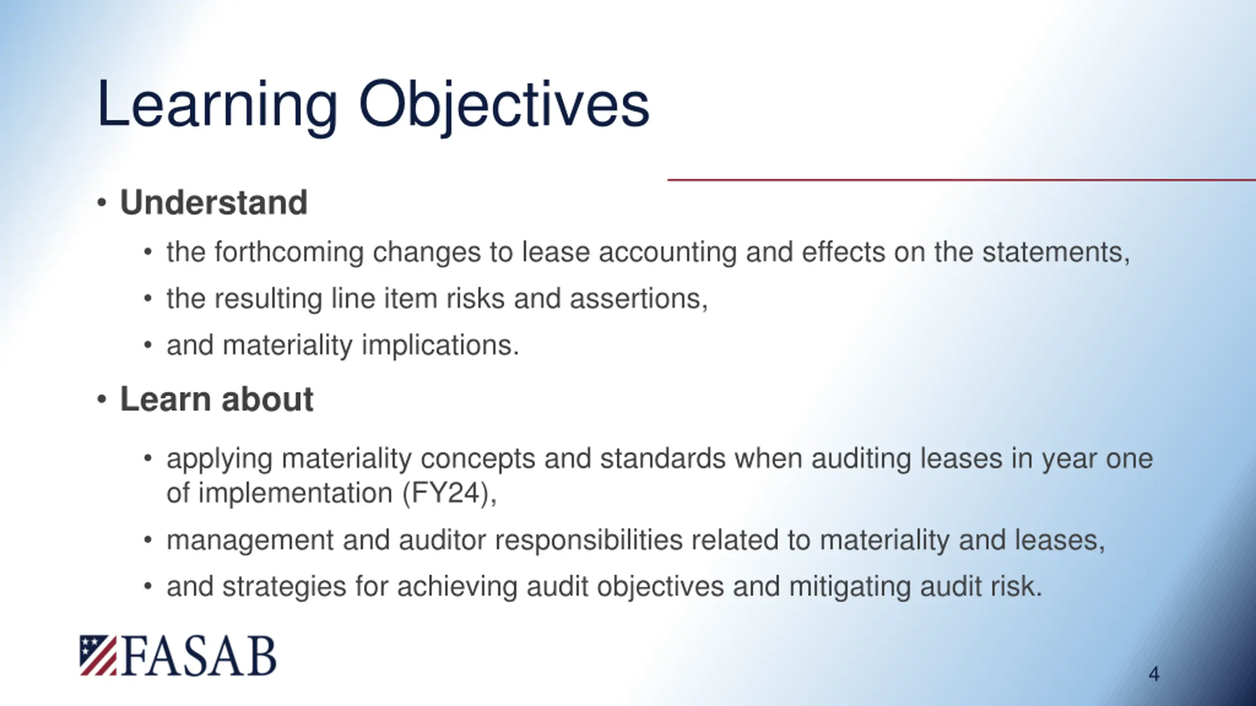 Learning Objectives Understand the forthcoming changes to lease accounting and effects on the statements, the resulting line item risks and assertions, and materiality implications. Learn about applying materiality concepts and standards when auditing leases in year one of implementation (FY24), management and auditor responsibilities related to materiality and leases, and strategies for achieving audit objectives and mitigating audit risk. 4