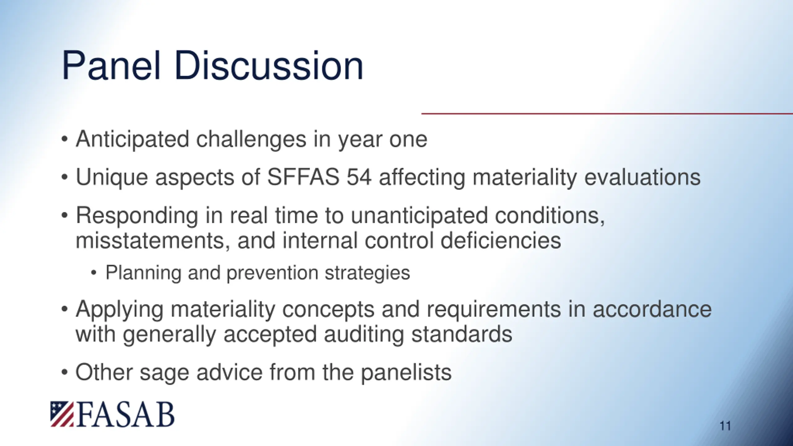 Materiality Auditor Responsibilities Responsibility: Obtain reasonable assurance about whether the statements, as a whole, are free from material misstatements Determine planning materiality SFFAS 54 affects the statements in the year of implementation and could thereby affect materiality base selections and calculations, with further cascading effects on risk assessment procedures risk of material misstatement, and the nature, timing, and extent of audit procedures Evaluate management s materiality determinations, decisions, evaluations, and related documentation Identify, communicate, and evaluate misstatements See: AU-C 200, AU-C 320, AU-C 450 10