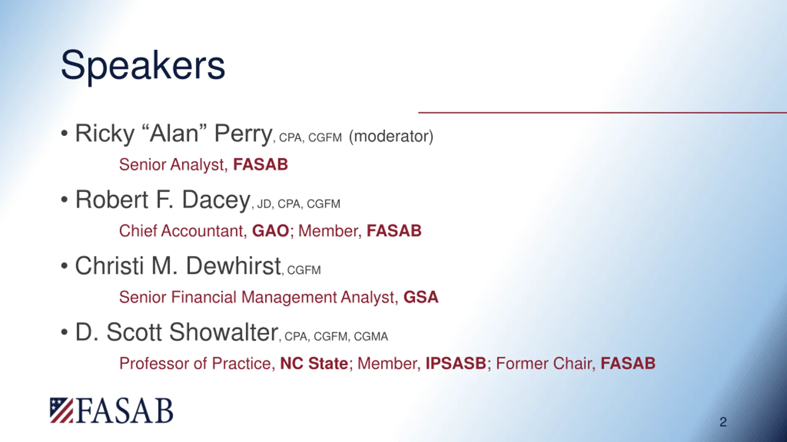 Speakers Ricky Alan Perry, CPA, CGFM (moderator) Senior Analyst, FASAB Robert F. Dacey, JD, CPA, CGFM Chief Accountant, GAO; Member, FASAB Christi M. Dewhirst, CGFM Senior Financial Management Analyst, GSA D. Scott Showalter, CPA, CGFM, CGMA Professor of Practice, NC State; Member, IPSASB; Former Chair, FASAB 2