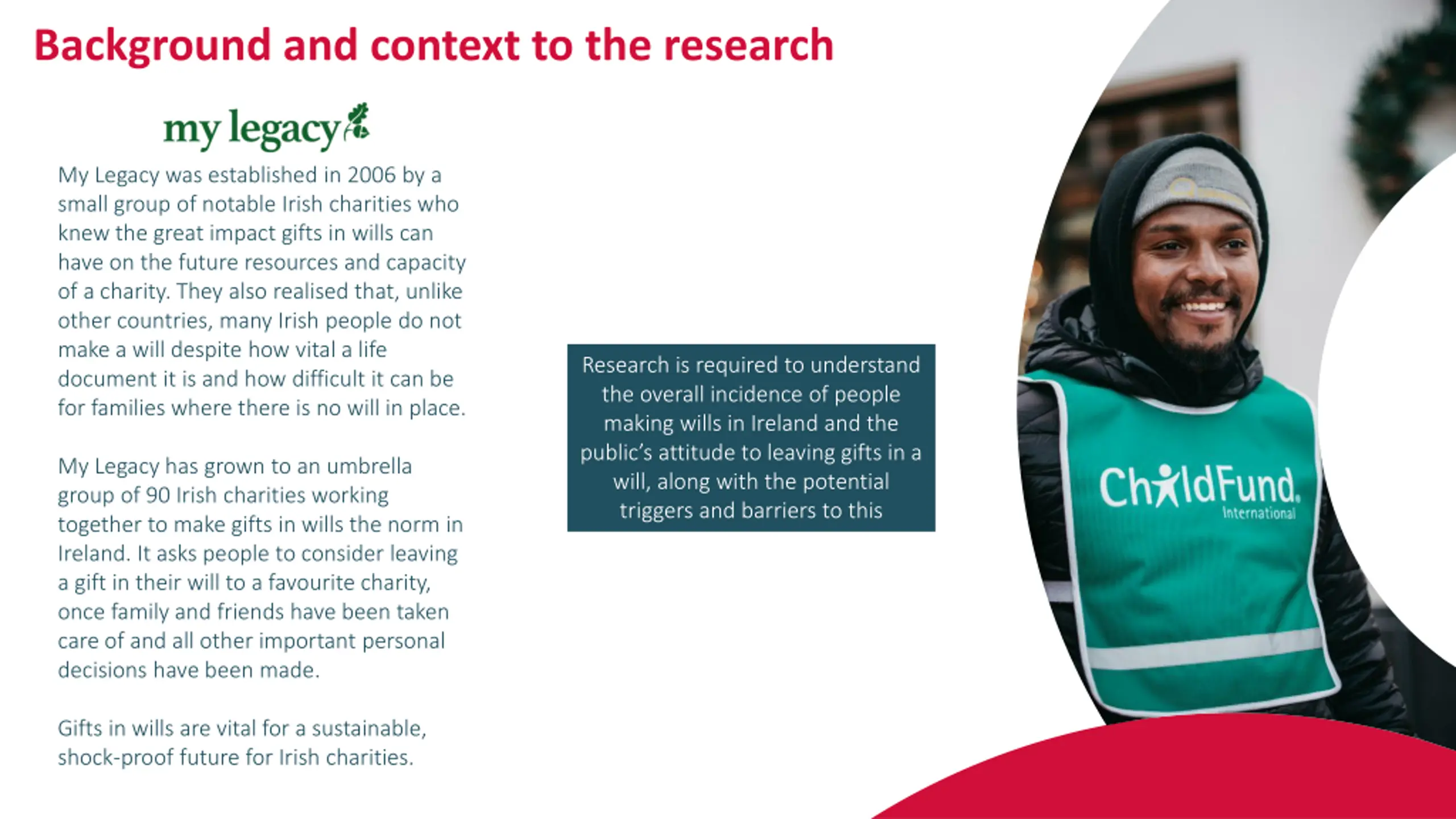 Background and context to the research My Legacy was established in 2006 by a small group of notable Irish charities who knew the great impact gifts in wills can have on the future resources and capacity of a charity. They also realised that, unlike other countries, many Irish people do not make a will despite how vital a life document it is and how difficult it can be for families where there is no will in place. Research is required to understand the overall incidence of people making wills in Ireland and the public s attitude to leaving gifts in a will, along with the potential triggers and barriers to this My Legacy has grown to an umbrella group of 90 Irish charities working together to make gifts in wills the norm in Ireland. It asks people to consider leaving a gift in their will to a favourite charity, once family and friends have been taken care of and all other important personal decisions have been made. Gifts in wills are vital for a sustainable, shock-proof future for Irish charities.