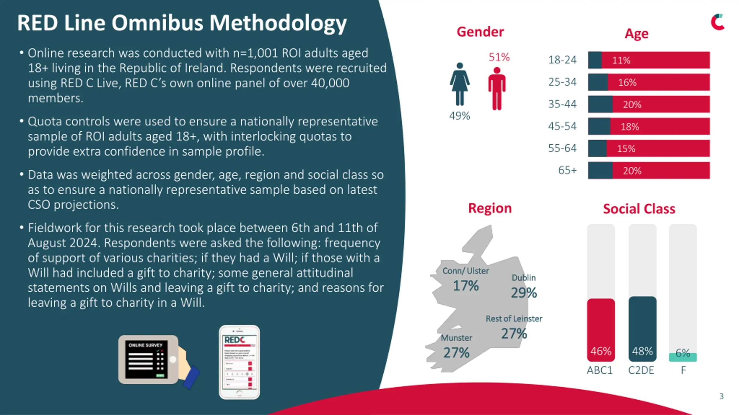 RED Line Omnibus Methodology Gender Age Online research was conducted with n=1,001 ROI adults aged 18+ living in the Republic of Ireland. Respondents were recruited using RED C Live, RED C s own online panel of over 40,000 members. 51% 18-24 11% 25-34 16% 35-44 20% 49% Quota controls were used to ensure a nationally representative sample of ROI adults aged 18+, with interlocking quotas to provide extra confidence in sample profile. 45-54 18% 55-64 15% 65+ 20% Data was weighted across gender, age, region and social class so as to ensure a nationally representative sample based on latest CSO projections. Region Social Class Fieldwork for this research took place between 6th and 11th of August 2024. Respondents were asked the following: frequency of support of various charities; if they had a Will; if those with a Will had included a gift to charity; some general attitudinal statements on Wills and leaving a gift to charity; and reasons for leaving a gift to charity in a Will. Conn/ Ulster Conn/ Ulster 17% 17% Dublin Dublin 29% 29% Rest of Leinster Rest of Leinster 27% 27% Munster Munster 27% 27% 46% 48% 6% F ABC1 C2DE 3