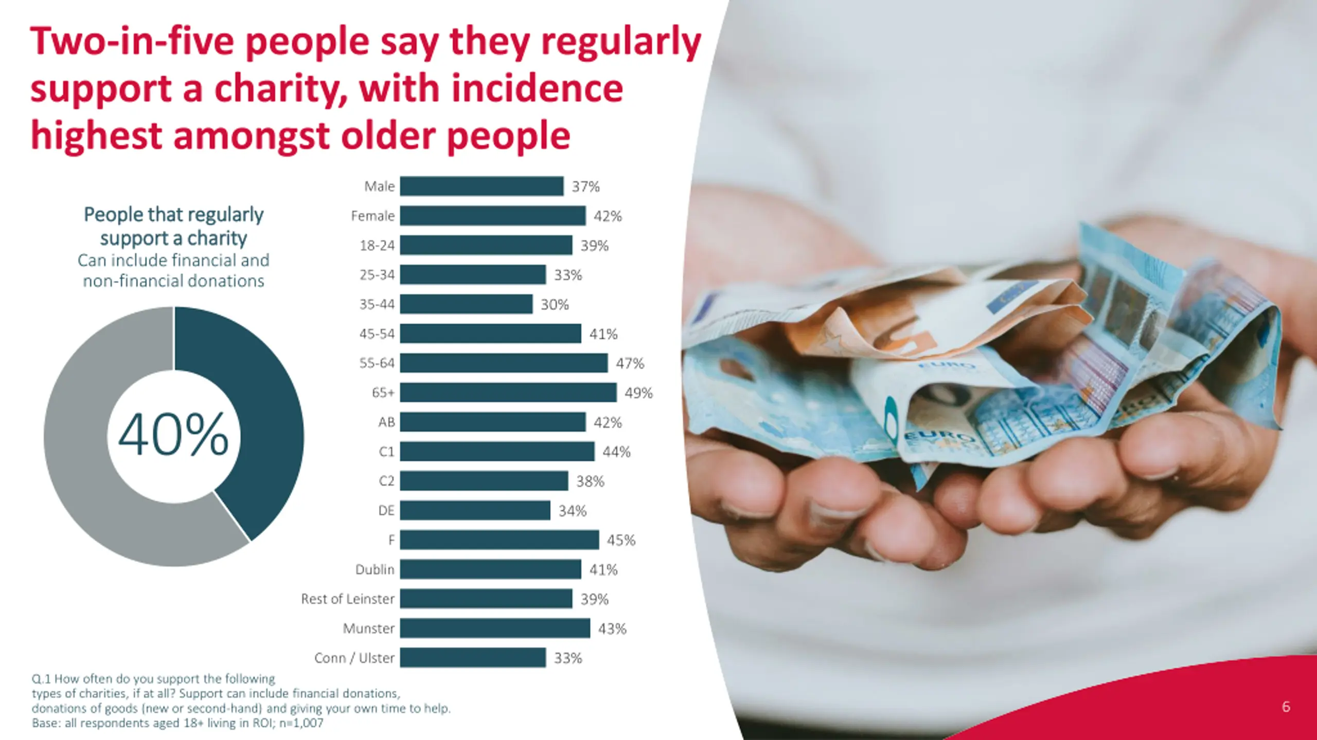 Support greatest for health-related charities in Ireland This includes organisations such as the Irish Cancer Society, the Irish Heart Foundation and the Alzheimer Society of Ireland. This is then followed by children related charities (Barnardos, Make-a-Wish, Childline, Laura-Lynn) and homelessness charities (Focus Ireland, Simon Community, Threshold) Frequency of supporting charitable organisations Frequency of supporting charitable organisations Regularly / occasionally 68% 56% 51% 45% 45% 44% 41% Occasionally 49% 46% 42% 32% 23% 34% 36% 37% 17% 20% 15% Regularly 19% 13% 10% 10% 9% 9% 4% 4% 3% Other Health Children Homeless Animals Humanitarian Elderly Environmental Arts and culture Q.1 How often do you support the following types of charities, if at all? Support can include financial donations, donations of goods (new or second-hand) and giving your own time to help. Base: all respondents aged 18+ living in ROI; n=1,007 5
