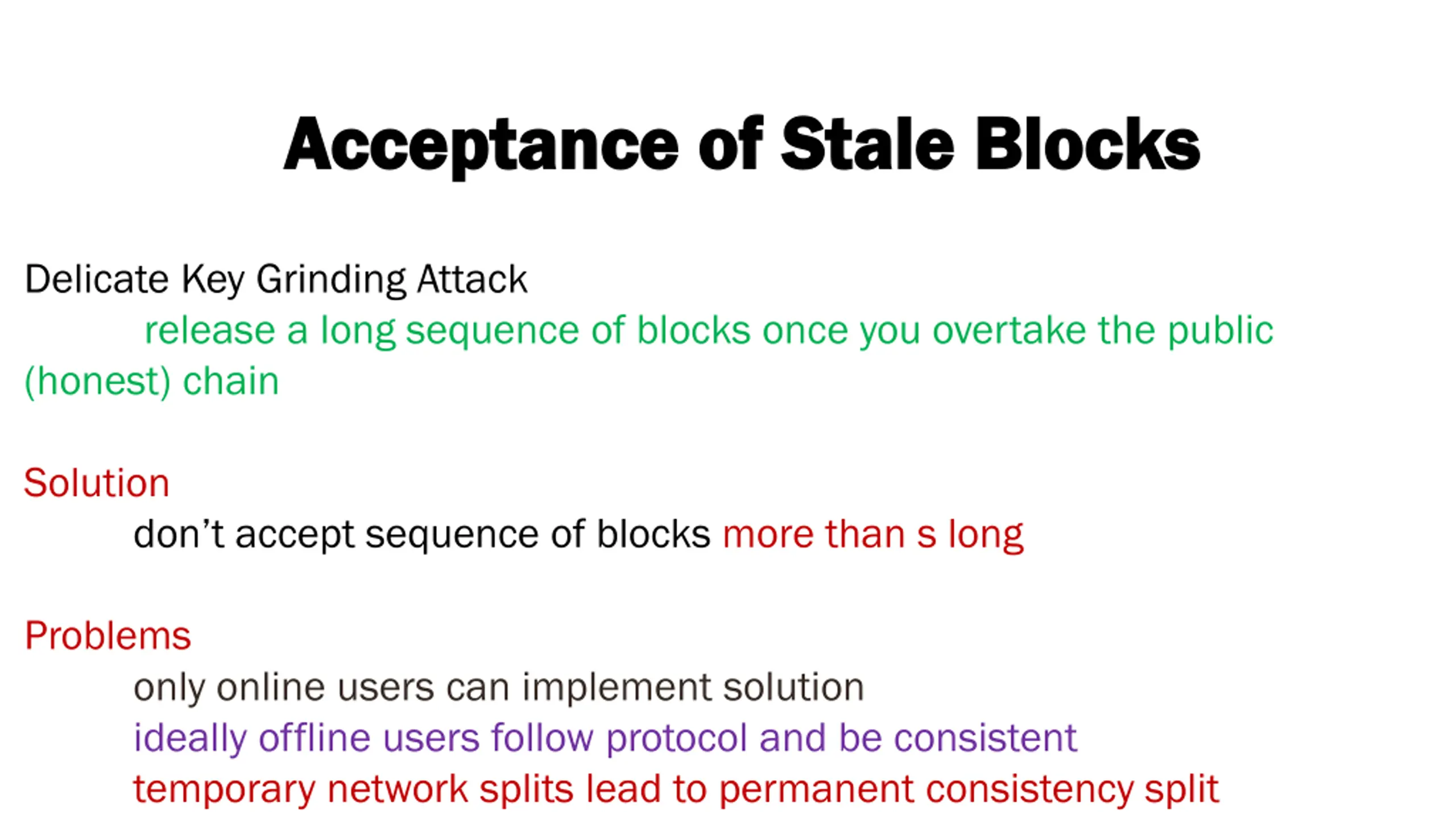 Acceptance of Stale Blocks Acceptance of Stale Blocks Delicate Key Grinding Attack release a long sequence of blocks once you overtake the public (honest) chain Solution don t accept sequence of blocks more than s long Problems only online users can implement solution ideally offline users follow protocol and be consistent temporary network splits lead to permanent consistency split