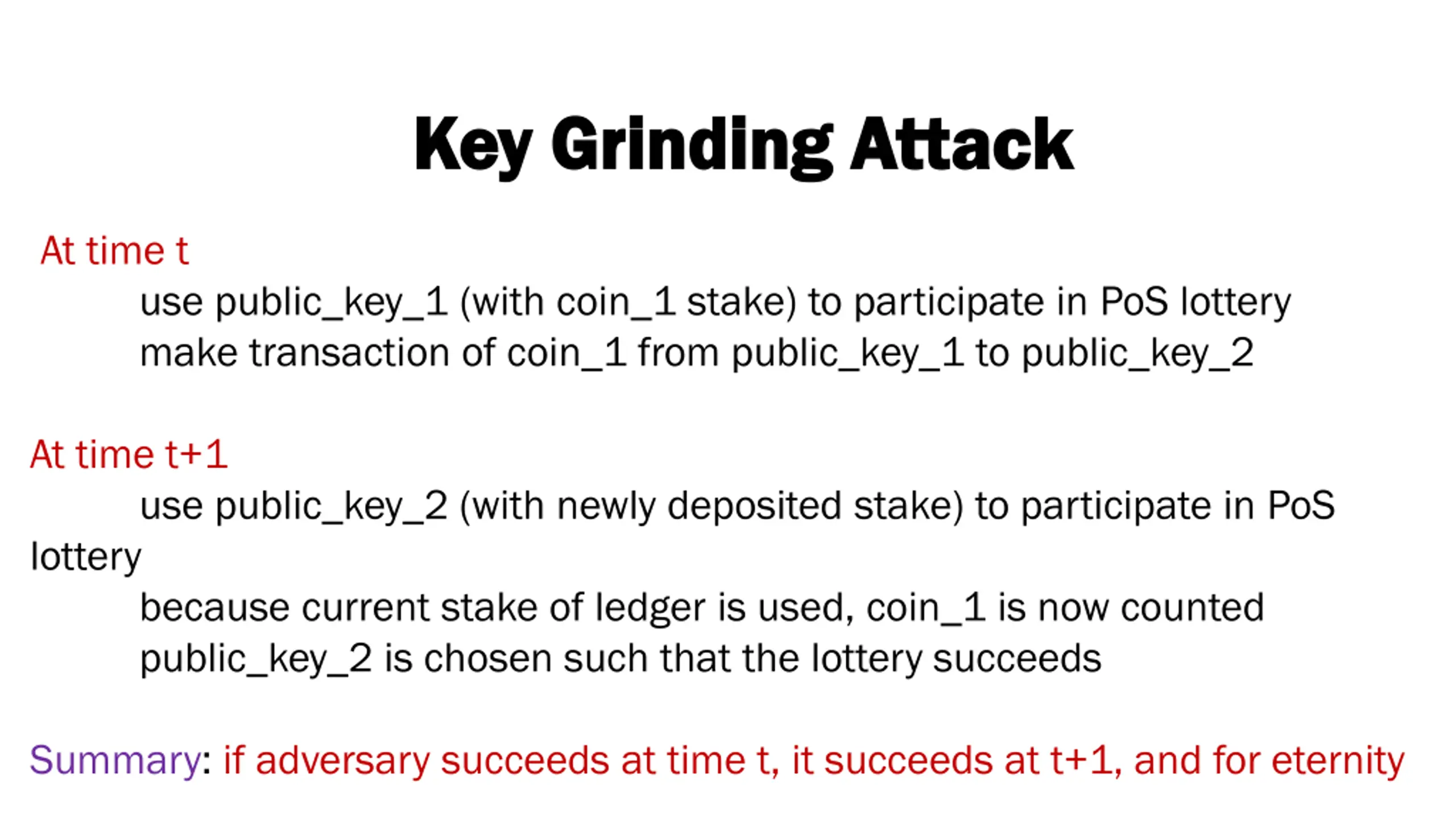 Key Grinding Attack Key Grinding Attack At time t use public_key_1 (with coin_1 stake) to participate in PoS lottery make transaction of coin_1 from public_key_1 to public_key_2 At time t+1 lottery use public_key_2 (with newly deposited stake) to participate in PoS because current stake of ledger is used, coin_1 is now counted public_key_2 is chosen such that the lottery succeeds Summary: if adversary succeeds at time t, it succeeds at t+1, and for eternity
