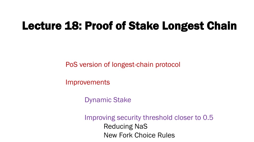 Lecture 18: Proof of Stake Longest Chain Lecture 18: Proof of Stake Longest Chain PoS version of longest-chain protocol Improvements Dynamic Stake Improving security threshold closer to 0.5 Reducing NaS New Fork Choice Rules