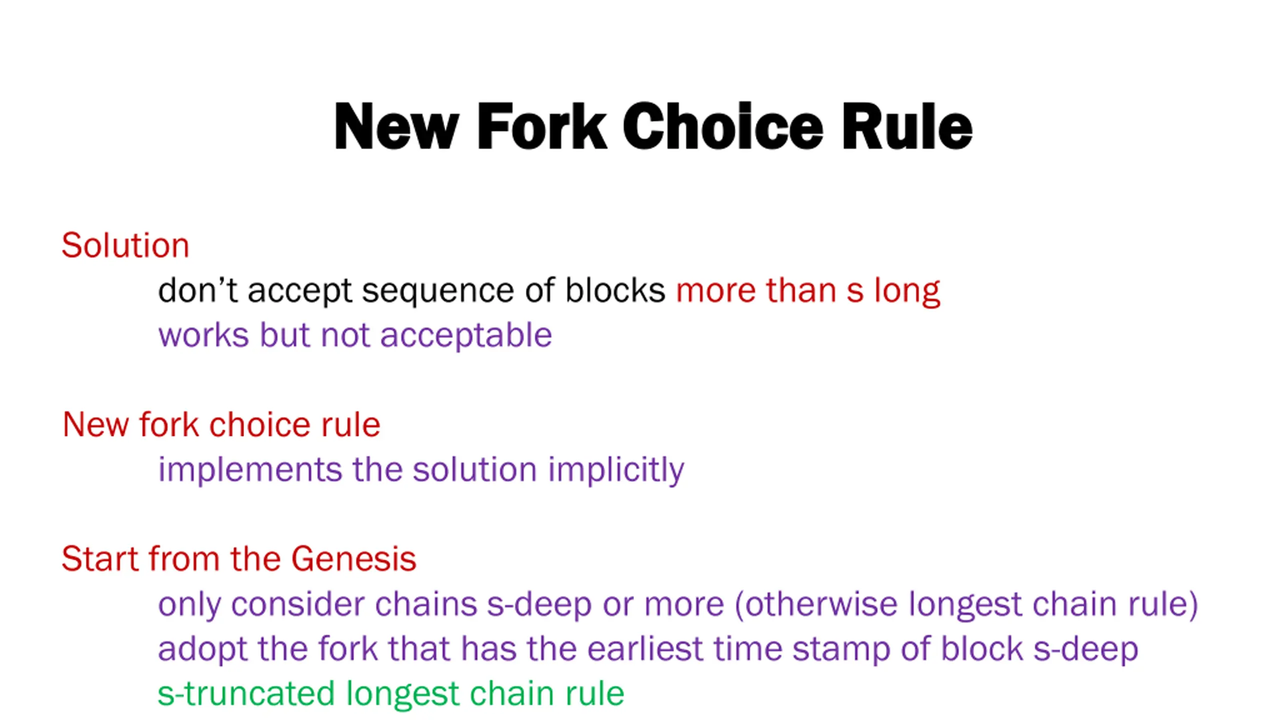 New Fork Choice Rule New Fork Choice Rule Solution don t accept sequence of blocks more than s long works but not acceptable New fork choice rule implements the solution implicitly Start from the Genesis only consider chains s-deep or more (otherwise longest chain rule) adopt the fork that has the earliest time stamp of block s-deep s-truncated longest chain rule