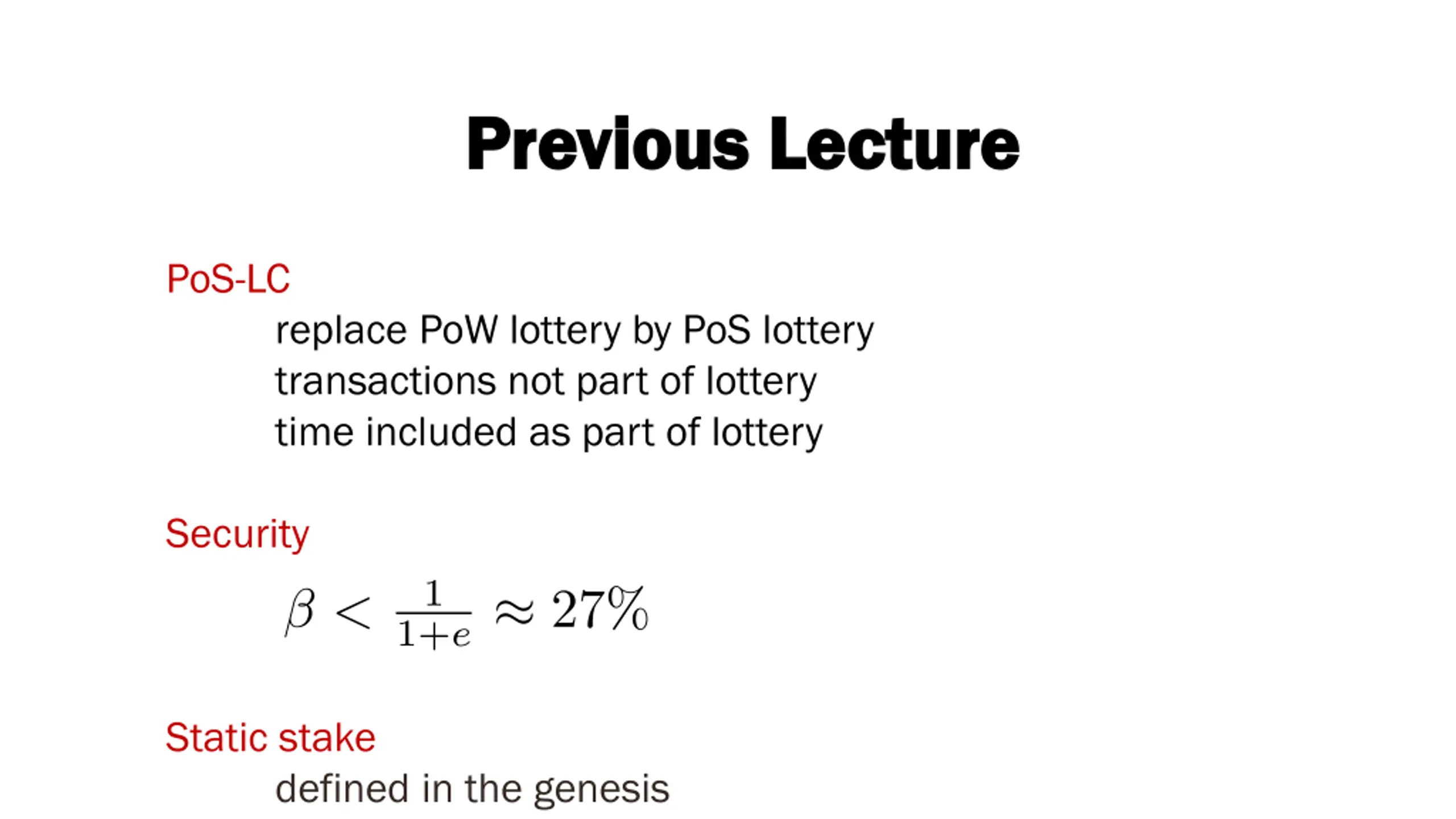 Previous Lecture Previous Lecture PoS-LC Security replace PoW lottery by PoS lottery transactions not part of lottery time included as part of lottery Static stake defined in the genesis