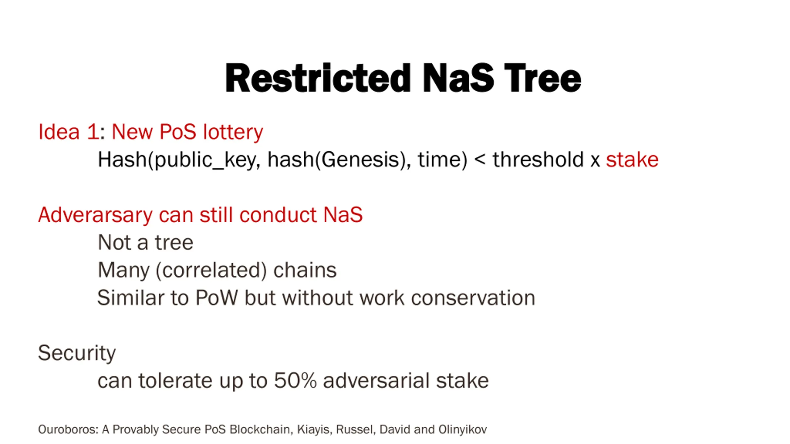 Restricted Restricted NaS NaS Tree Tree Idea 1: New PoS lottery Hash(public_key, hash(Genesis), time) < threshold x stake Adverarsary can still conduct NaS Not a tree Many (correlated) chains Similar to PoW but without work conservation Security can tolerate up to 50% adversarial stake Ouroboros: A Provably Secure PoS Blockchain, Kiayis, Russel, David and Olinyikov