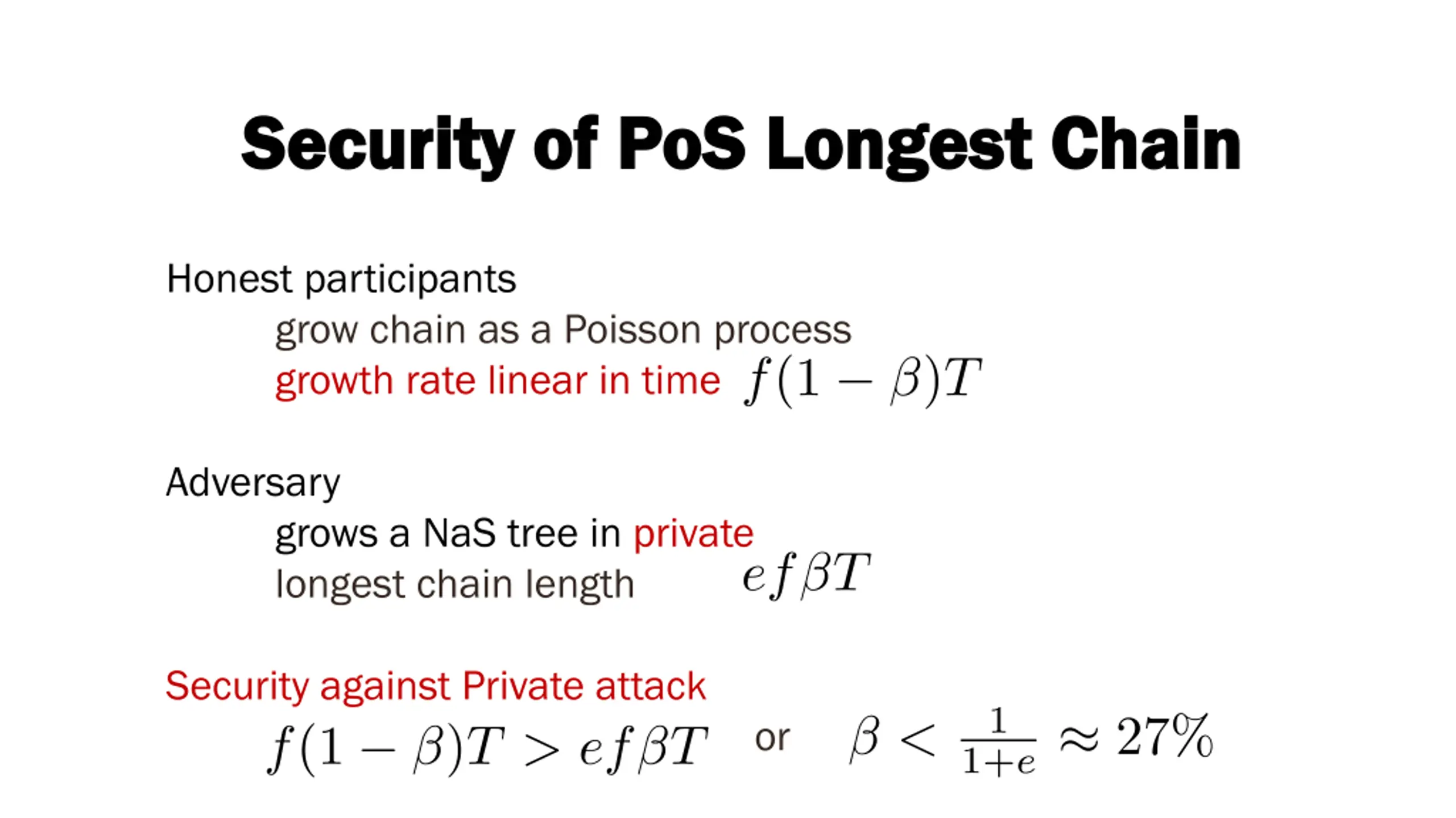 Security of Security of PoS PoS Longest Chain Longest Chain Honest participants grow chain as a Poisson process growth rate linear in time Adversary grows a NaS tree in private longest chain length Security against Private attack or