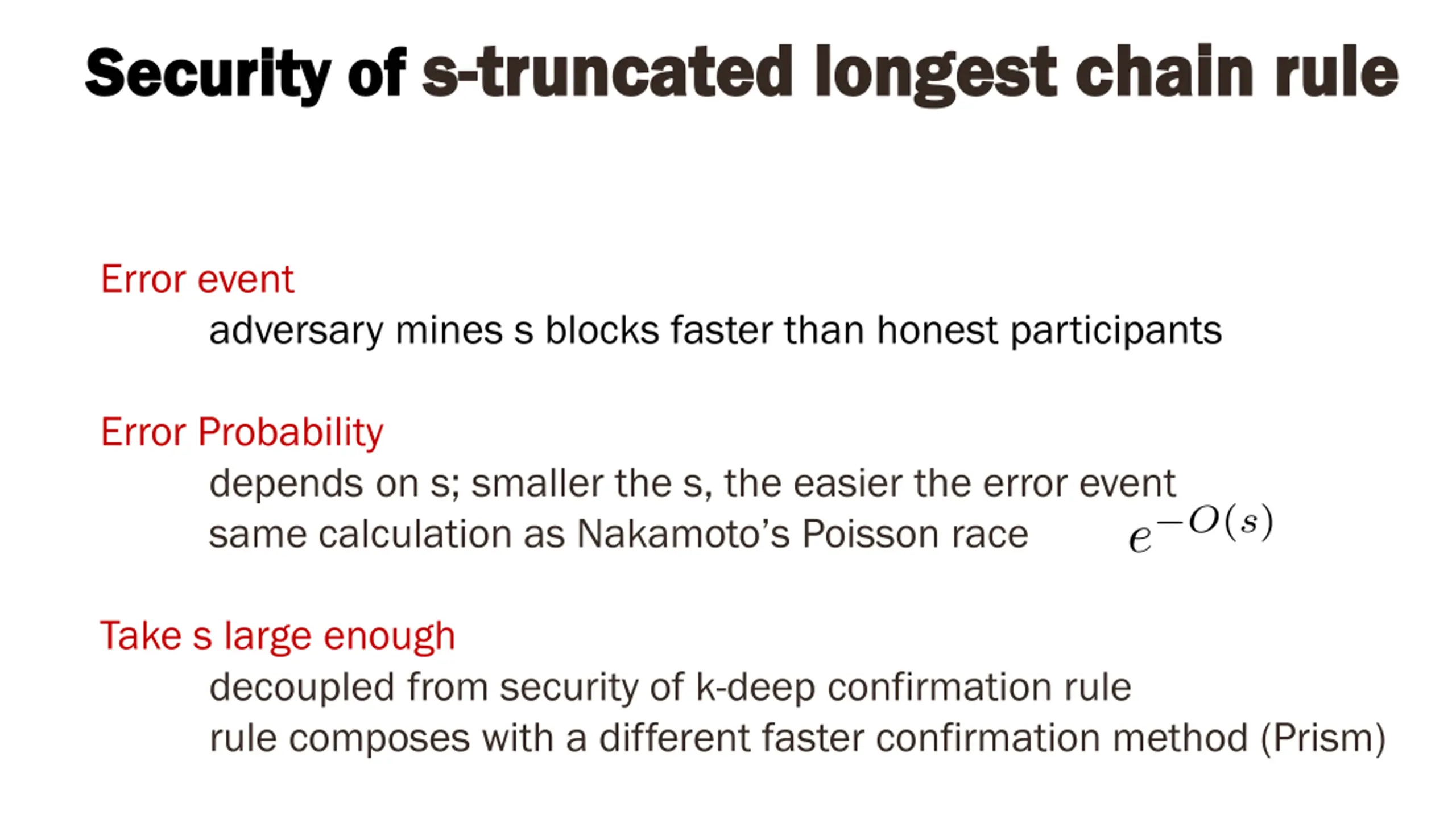 Security of Security of s s- -truncated longest chain rule truncated longest chain rule Error event adversary mines s blocks faster than honest participants Error Probability depends on s; smaller the s, the easier the error event same calculation as Nakamoto s Poisson race Take s large enough decoupled from security of k-deep confirmation rule rule composes with a different faster confirmation method (Prism)