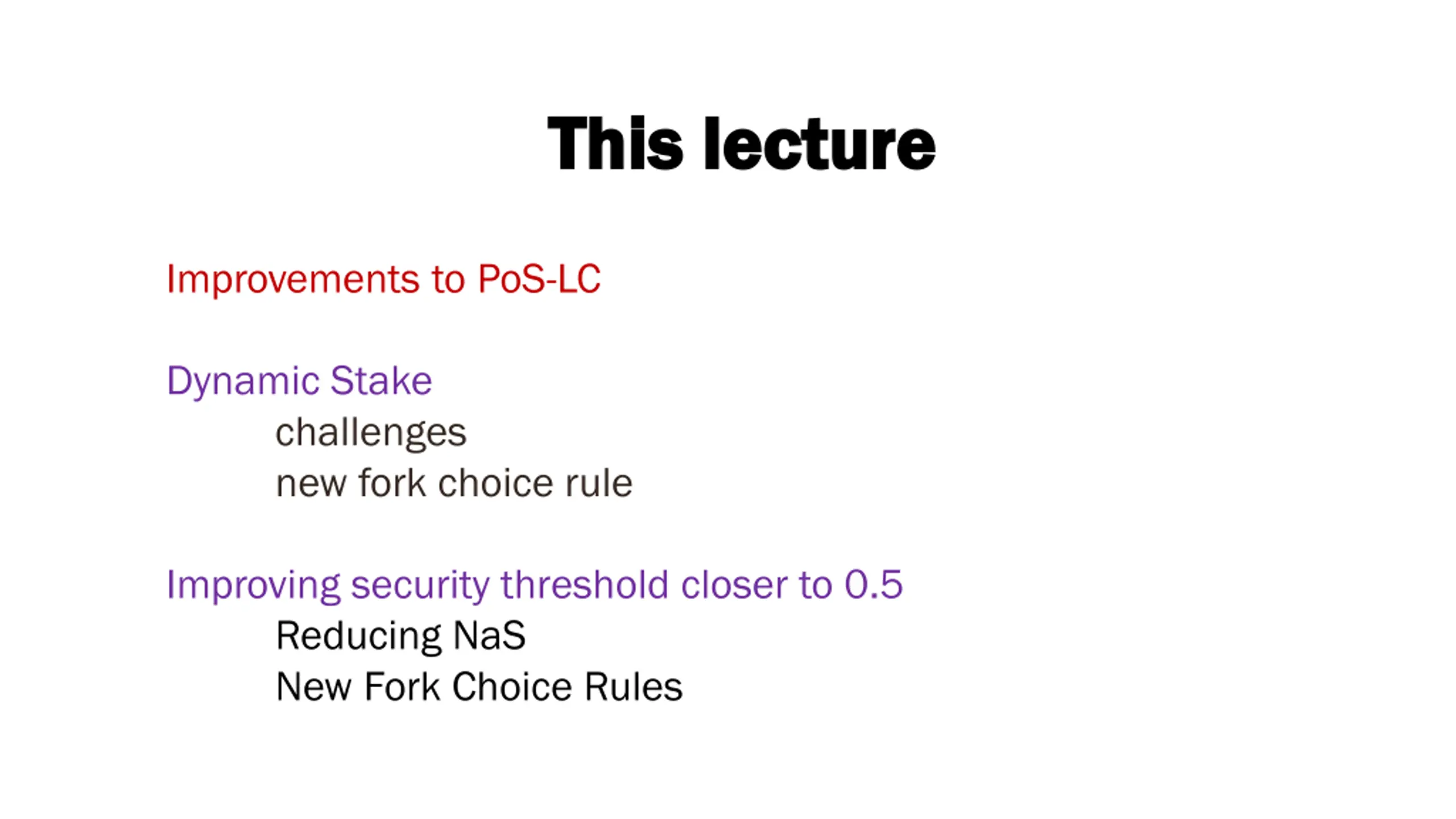 This lecture This lecture Improvements to PoS-LC Dynamic Stake challenges new fork choice rule Improving security threshold closer to 0.5 Reducing NaS New Fork Choice Rules