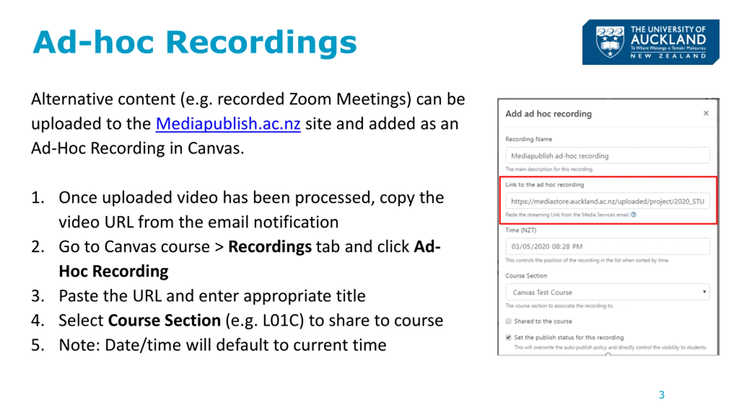 Ad-hoc Recordings Alternative content (e.g. recorded Zoom Meetings) can be uploaded to the Mediapublish.ac.nz site and added as an Ad-Hoc Recording in Canvas. 1. Once uploaded video has been processed, copy the video URL from the email notification 2. Go to Canvas course > Recordings tab and click Ad- Hoc Recording 3. Paste the URL and enter appropriate title 4. Select Course Section (e.g. L01C) to share to course 5. Note: Date/time will default to current time 3