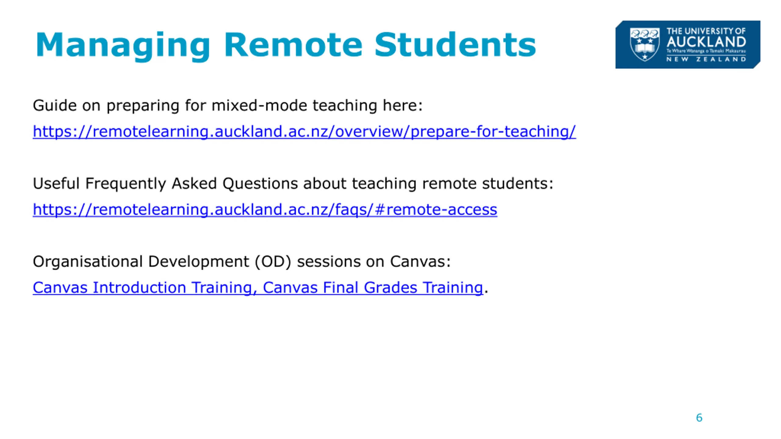 Managing Remote Students Guide on preparing for mixed-mode teaching here: https://remotelearning.auckland.ac.nz/overview/prepare-for-teaching/ Useful Frequently Asked Questions about teaching remote students: https://remotelearning.auckland.ac.nz/faqs/#remote-access Organisational Development (OD) sessions on Canvas: Canvas Introduction Training, Canvas Final Grades Training. 6