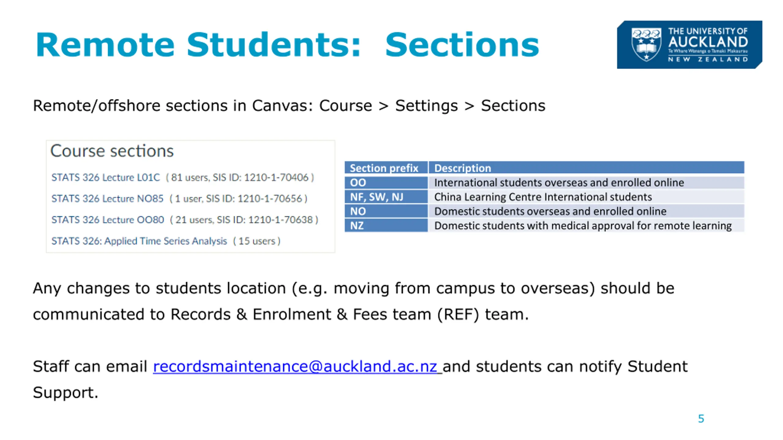 Remote Students: Sections Remote/offshore sections in Canvas: Course > Settings > Sections Section prefix OO NF, SW, NJ NO NZ Description International students overseas and enrolled online China Learning Centre International students Domestic students overseas and enrolled online Domestic students with medical approval for remote learning Any changes to students location (e.g. moving from campus to overseas) should be communicated to Records & Enrolment & Fees team (REF) team. Staff can email recordsmaintenance@auckland.ac.nz and students can notify Student Support. 5