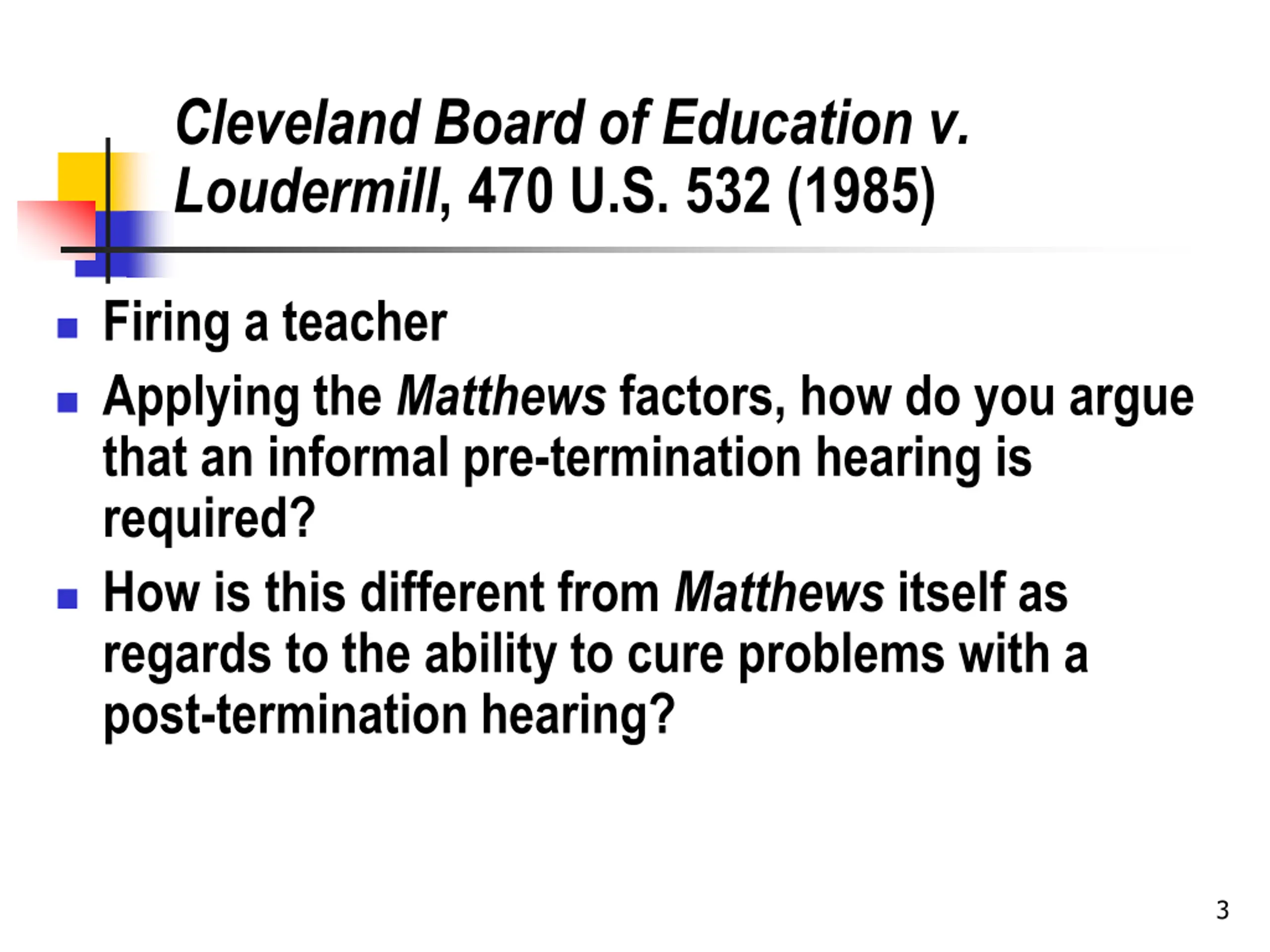 Cleveland Board of Education v. Loudermill, 470 U.S. 532 (1985) Firing a teacher Applying the Matthews factors, how do you argue that an informal pre-termination hearing is required? How is this different from Matthews itself as regards to the ability to cure problems with a post-termination hearing? 3