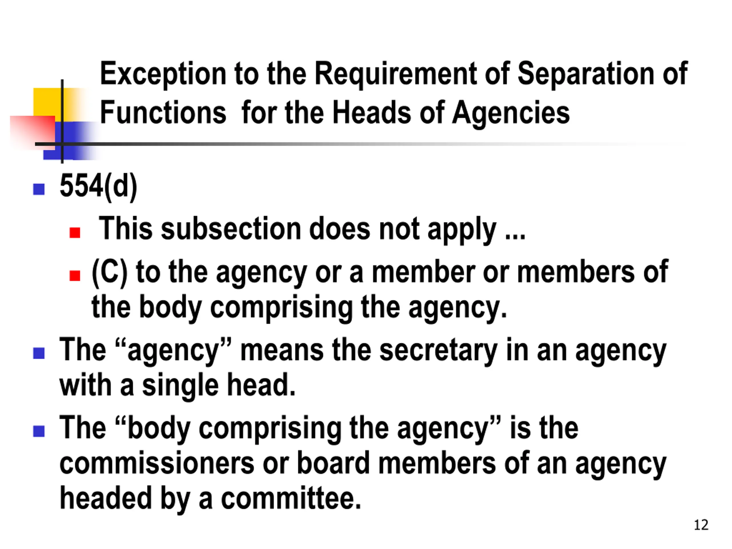 Exception to the Requirement of Separation of Functions for the Heads of Agencies 554(d) This subsection does not apply ... (C) to the agency or a member or members of the body comprising the agency. The agency means the secretary in an agency with a single head. The body comprising the agency is the commissioners or board members of an agency headed by a committee. 12