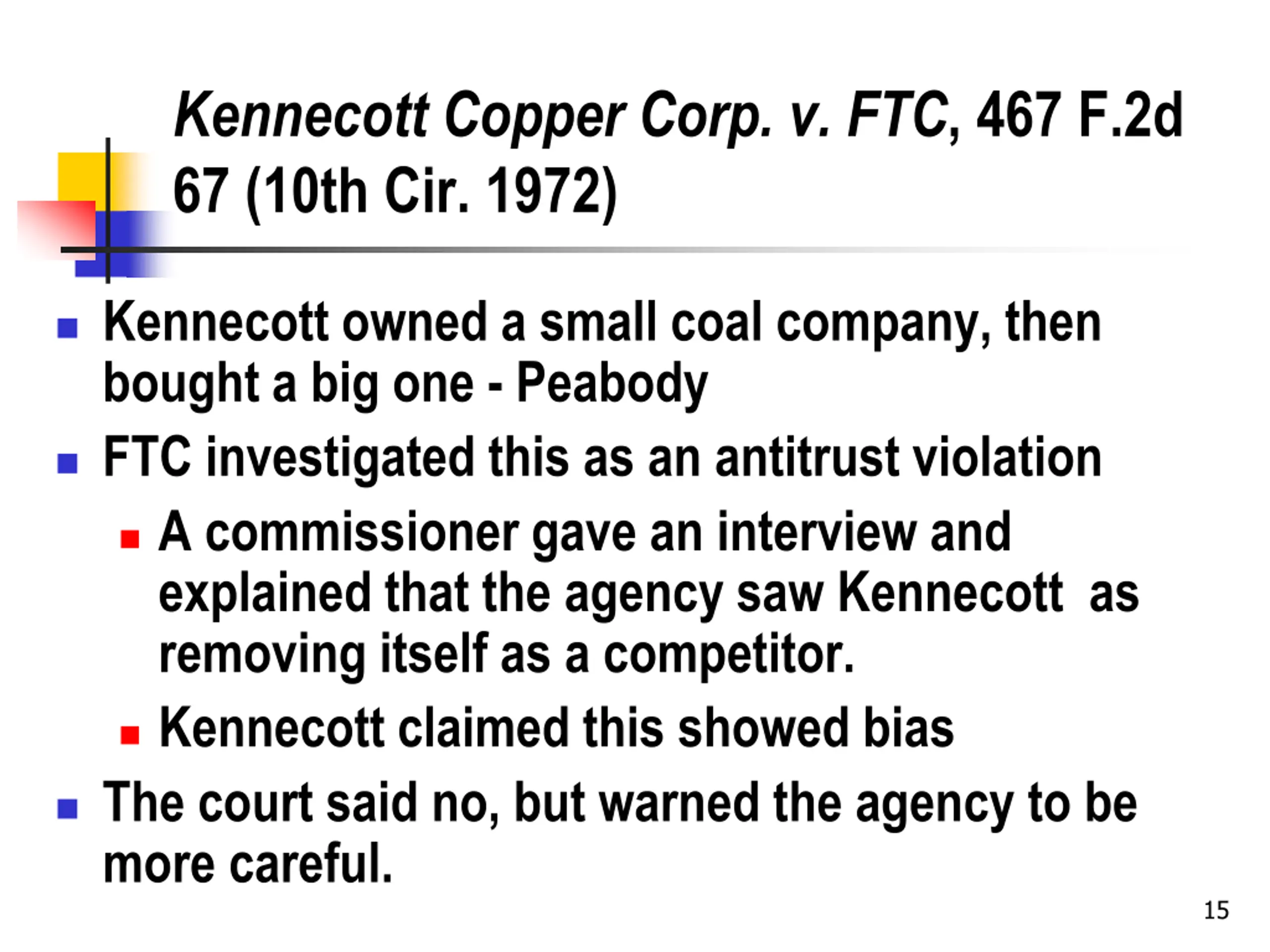 Kennecott Copper Corp. v. FTC, 467 F.2d 67 (10th Cir. 1972) Kennecott owned a small coal company, then bought a big one - Peabody FTC investigated this as an antitrust violation A commissioner gave an interview and explained that the agency saw Kennecott as removing itself as a competitor. Kennecott claimed this showed bias The court said no, but warned the agency to be more careful. 15