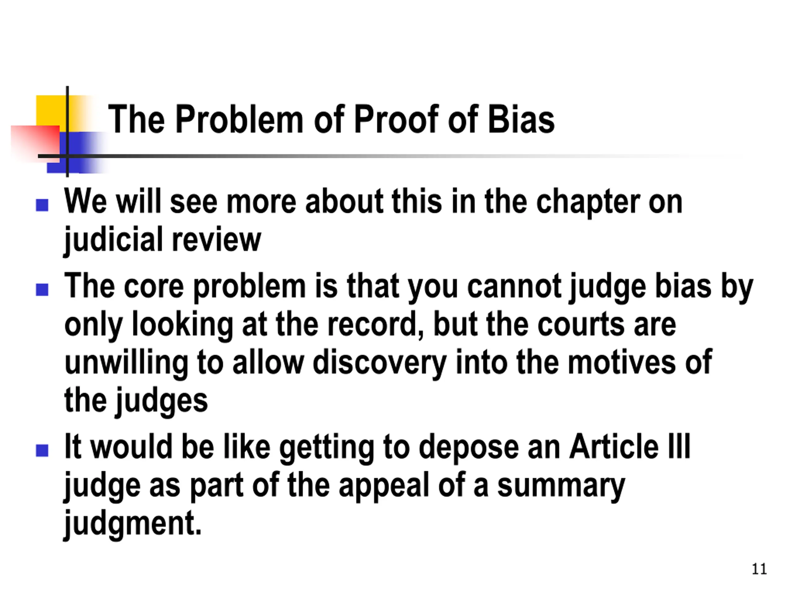 The Problem of Proof of Bias We will see more about this in the chapter on judicial review The core problem is that you cannot judge bias by only looking at the record, but the courts are unwilling to allow discovery into the motives of the judges It would be like getting to depose an Article III judge as part of the appeal of a summary judgment. 11