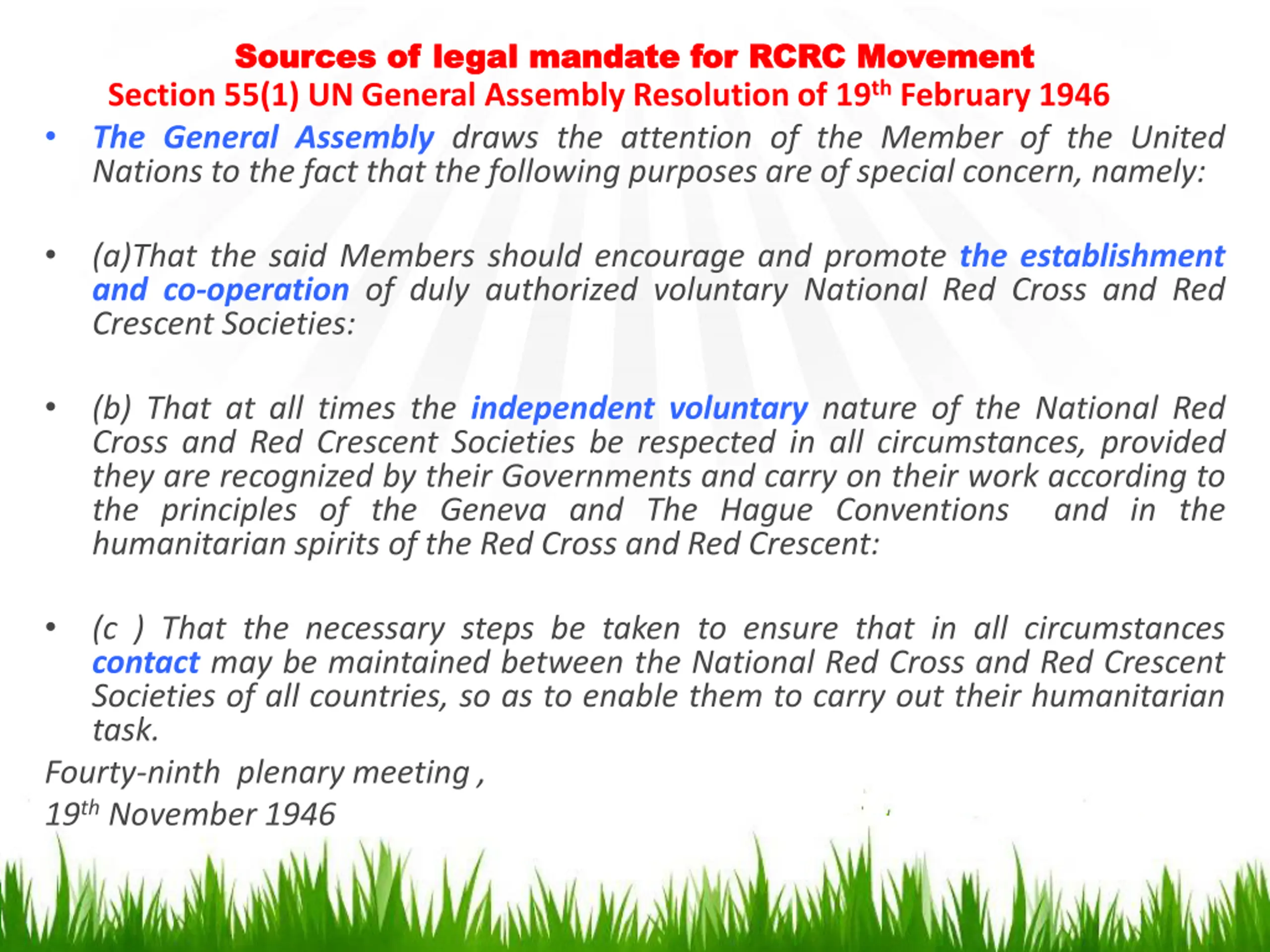 Sources of legal mandate for RCRC Movement Sources of legal mandate for RCRC Movement Section 55(1) UN General Assembly Resolution of 19th February 1946 The General Assembly draws the attention of the Member of the United Nations to the fact that the following purposes are of special concern, namely: (a)That the said Members should encourage and promote the establishment and co-operation of duly authorized voluntary National Red Cross and Red Crescent Societies: (b) That at all times the independent voluntary nature of the National Red Cross and Red Crescent Societies be respected in all circumstances, provided they are recognized by their Governments and carry on their work according to the principles of the Geneva and The Hague Conventions and in the humanitarian spirits of the Red Cross and Red Crescent: (c ) That the necessary steps be taken to ensure that in all circumstances contact may be maintained between the National Red Cross and Red Crescent Societies of all countries, so as to enable them to carry out their humanitarian task. Fourty-ninth plenary meeting , 19th November 1946