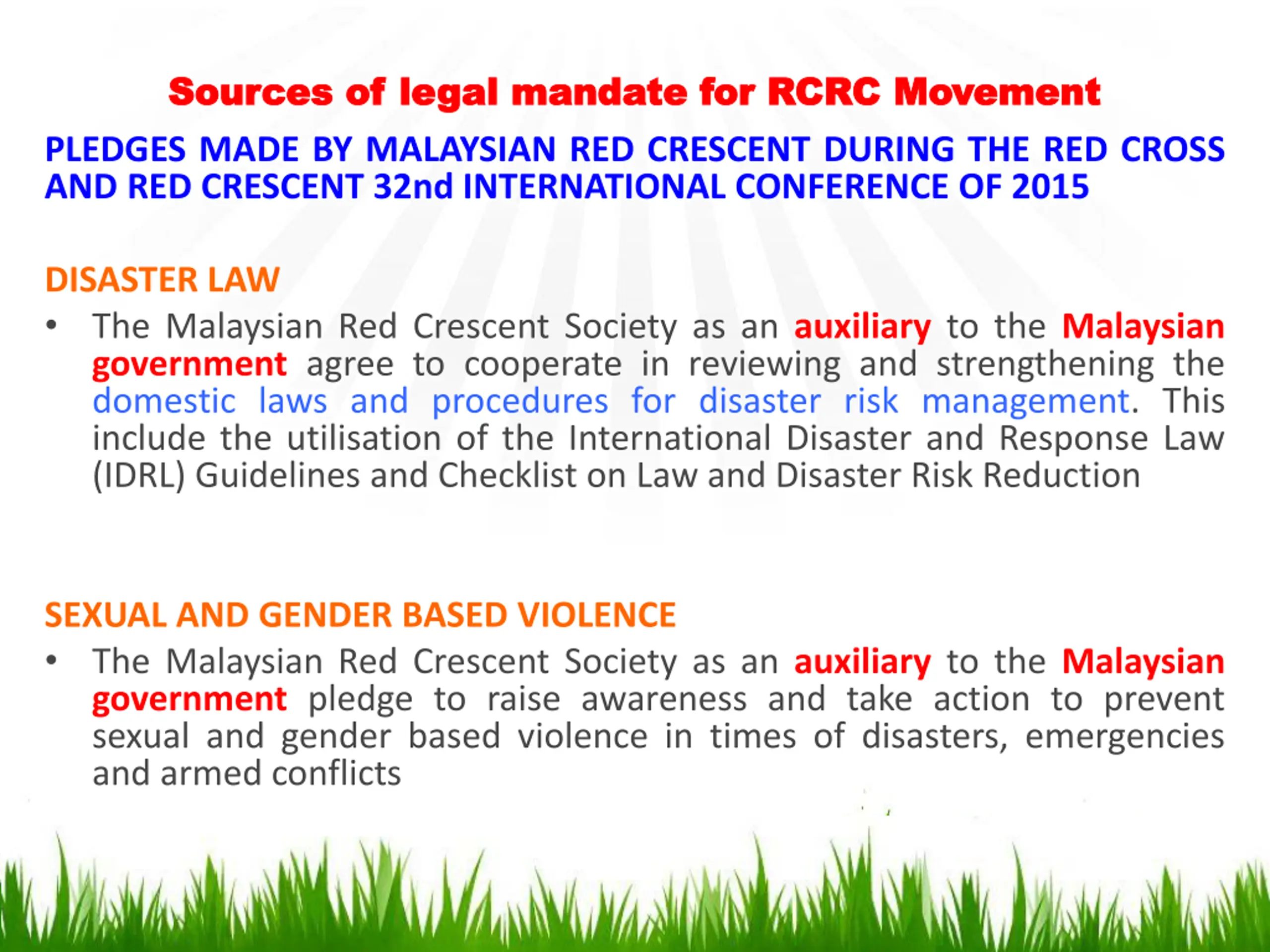 Sources of legal mandate for RCRC Movement Sources of legal mandate for RCRC Movement PLEDGES MADE BY MALAYSIAN RED CRESCENT DURING THE RED CROSS AND RED CRESCENT 32nd INTERNATIONAL CONFERENCE OF 2015 DISASTER LAW The Malaysian Red Crescent Society as an auxiliary to the Malaysian government agree to cooperate in reviewing and strengthening the domestic laws and procedures for disaster risk management. This include the utilisation of the International Disaster and Response Law (IDRL) Guidelines and Checklist on Law and Disaster Risk Reduction SEXUAL AND GENDER BASED VIOLENCE The Malaysian Red Crescent Society as an auxiliary to the Malaysian government pledge to raise awareness and take action to prevent sexual and gender based violence in times of disasters, emergencies and armed conflicts