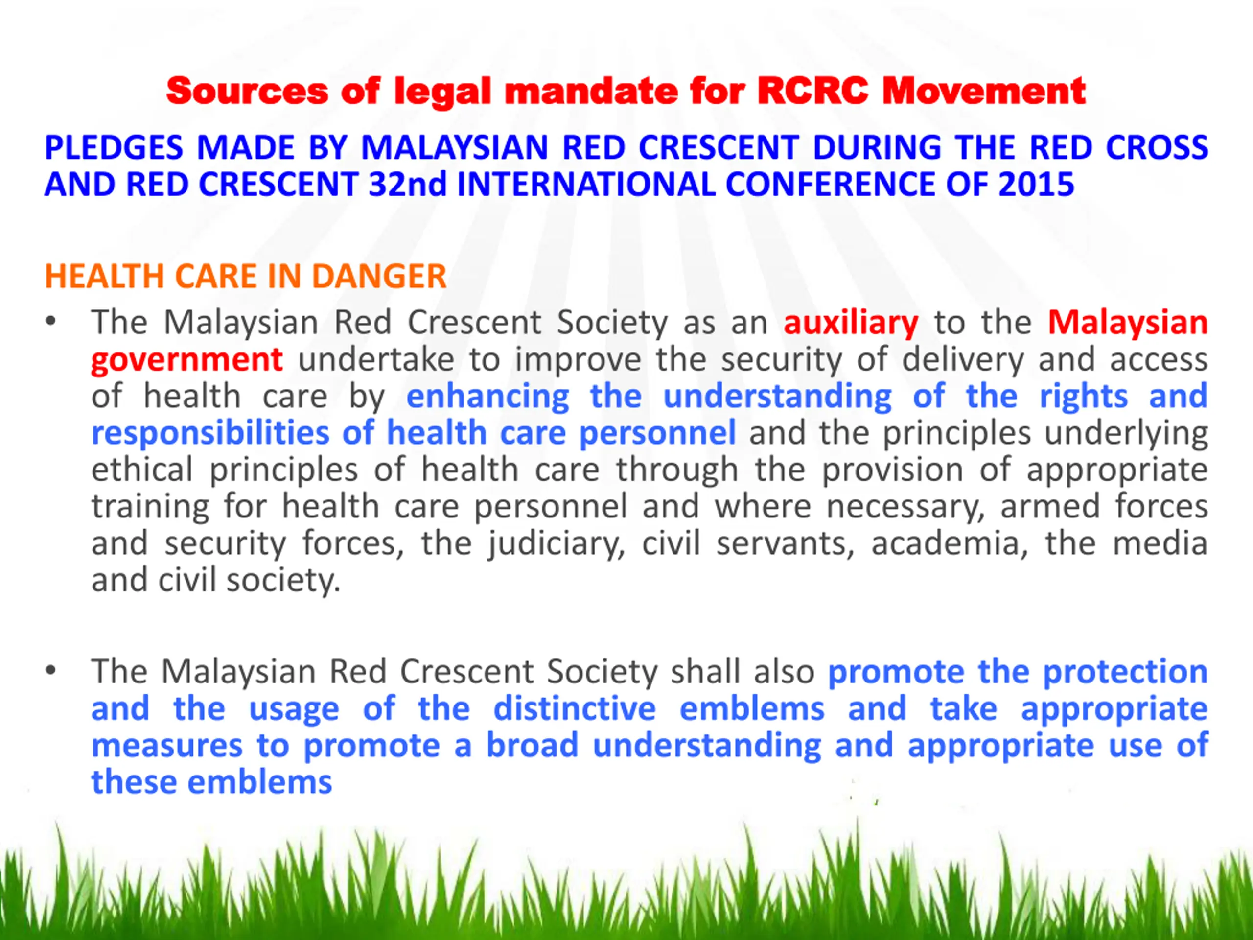 Sources of legal mandate for RCRC Movement Sources of legal mandate for RCRC Movement PLEDGES MADE BY MALAYSIAN RED CRESCENT DURING THE RED CROSS AND RED CRESCENT 32nd INTERNATIONAL CONFERENCE OF 2015 HEALTH CARE IN DANGER The Malaysian Red Crescent Society as an auxiliary to the Malaysian government undertake to improve the security of delivery and access of health care by enhancing the understanding of the rights and responsibilities of health care personnel and the principles underlying ethical principles of health care through the provision of appropriate training for health care personnel and where necessary, armed forces and security forces, the judiciary, civil servants, academia, the media and civil society. The Malaysian Red Crescent Society shall also promote the protection and the usage of the distinctive emblems and take appropriate measures to promote a broad understanding and appropriate use of these emblems