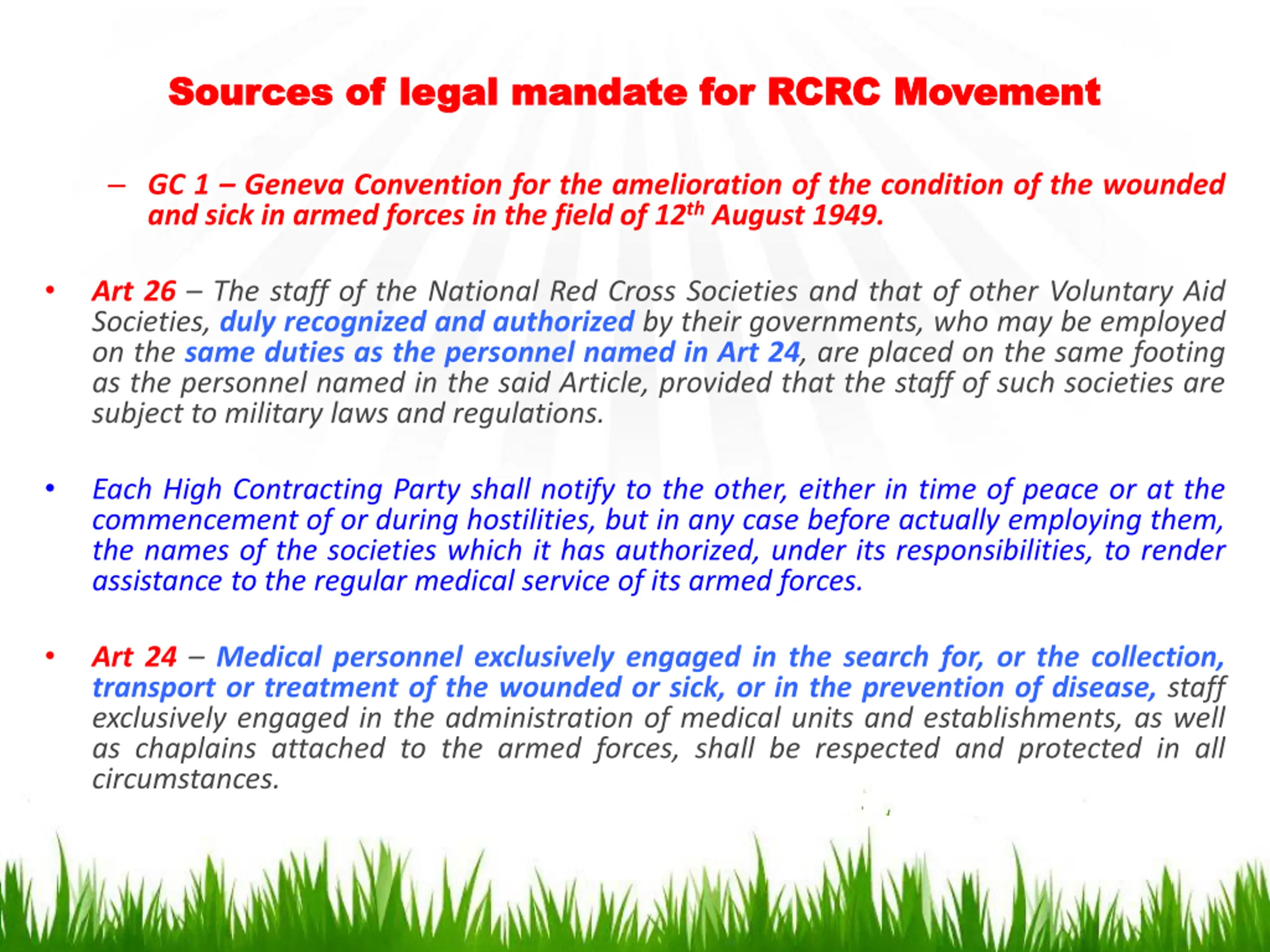 Sources of legal mandate for RCRC Movement Sources of legal mandate for RCRC Movement GC 1 Geneva Convention for the amelioration of the condition of the wounded and sick in armed forces in the field of 12th August 1949. Art 26 The staff of the National Red Cross Societies and that of other Voluntary Aid Societies, duly recognized and authorized by their governments, who may be employed on the same duties as the personnel named in Art 24, are placed on the same footing as the personnel named in the said Article, provided that the staff of such societies are subject to military laws and regulations. Each High Contracting Party shall notify to the other, either in time of peace or at the commencement of or during hostilities, but in any case before actually employing them, the names of the societies which it has authorized, under its responsibilities, to render assistance to the regular medical service of its armed forces. Art 24 Medical personnel exclusively engaged in the search for, or the collection, transport or treatment of the wounded or sick, or in the prevention of disease, staff exclusively engaged in the administration of medical units and establishments, as well as chaplains attached to the armed forces, shall be respected and protected in all circumstances.