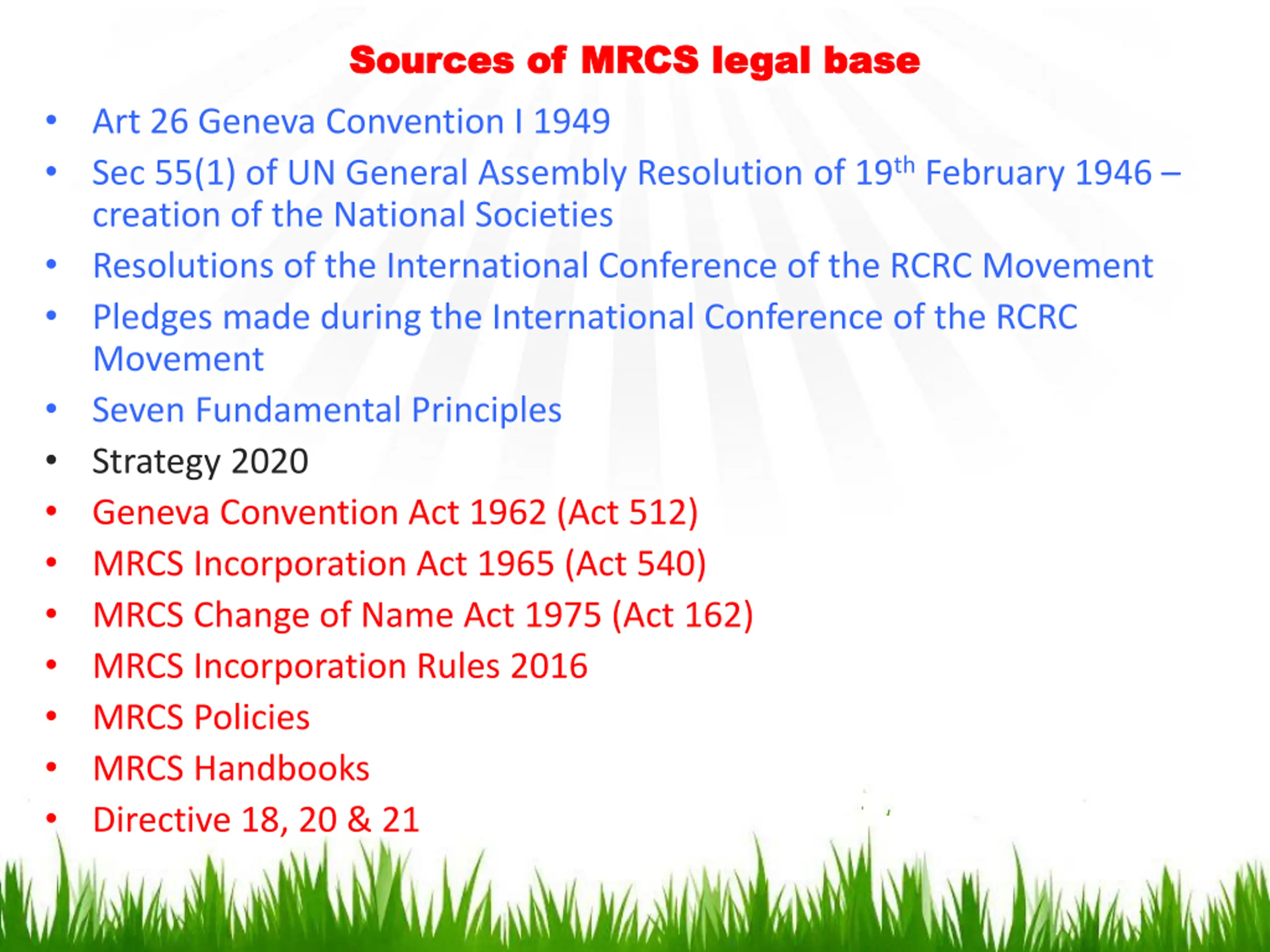 Sources of Sources of MRCS legal base MRCS legal base Art 26 Geneva Convention I 1949 Sec 55(1) of UN General Assembly Resolution of 19th February 1946 creation of the National Societies Resolutions of the International Conference of the RCRC Movement Pledges made during the International Conference of the RCRC Movement Seven Fundamental Principles Strategy 2020 Geneva Convention Act 1962 (Act 512) MRCS Incorporation Act 1965 (Act 540) MRCS Change of Name Act 1975 (Act 162) MRCS Incorporation Rules 2016 MRCS Policies MRCS Handbooks Directive 18, 20 & 21