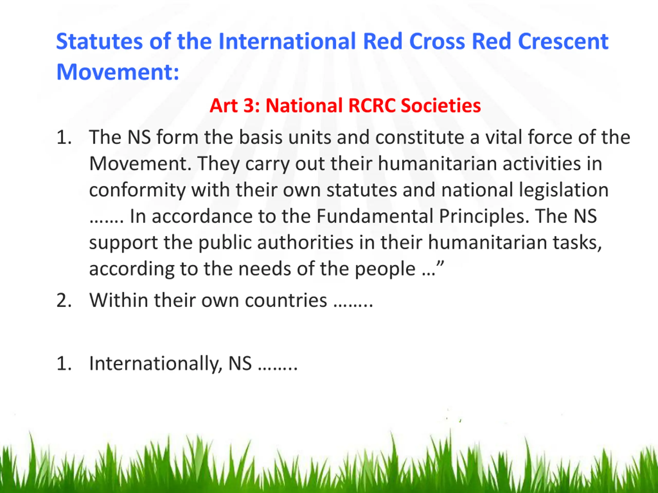 Statutes of the International Red Cross Red Crescent Movement: Art 3: National RCRC Societies 1. The NS form the basis units and constitute a vital force of the Movement. They carry out their humanitarian activities in conformity with their own statutes and national legislation . In accordance to the Fundamental Principles. The NS support the public authorities in their humanitarian tasks, according to the needs of the people 2. Within their own countries .. 1. Internationally, NS ..