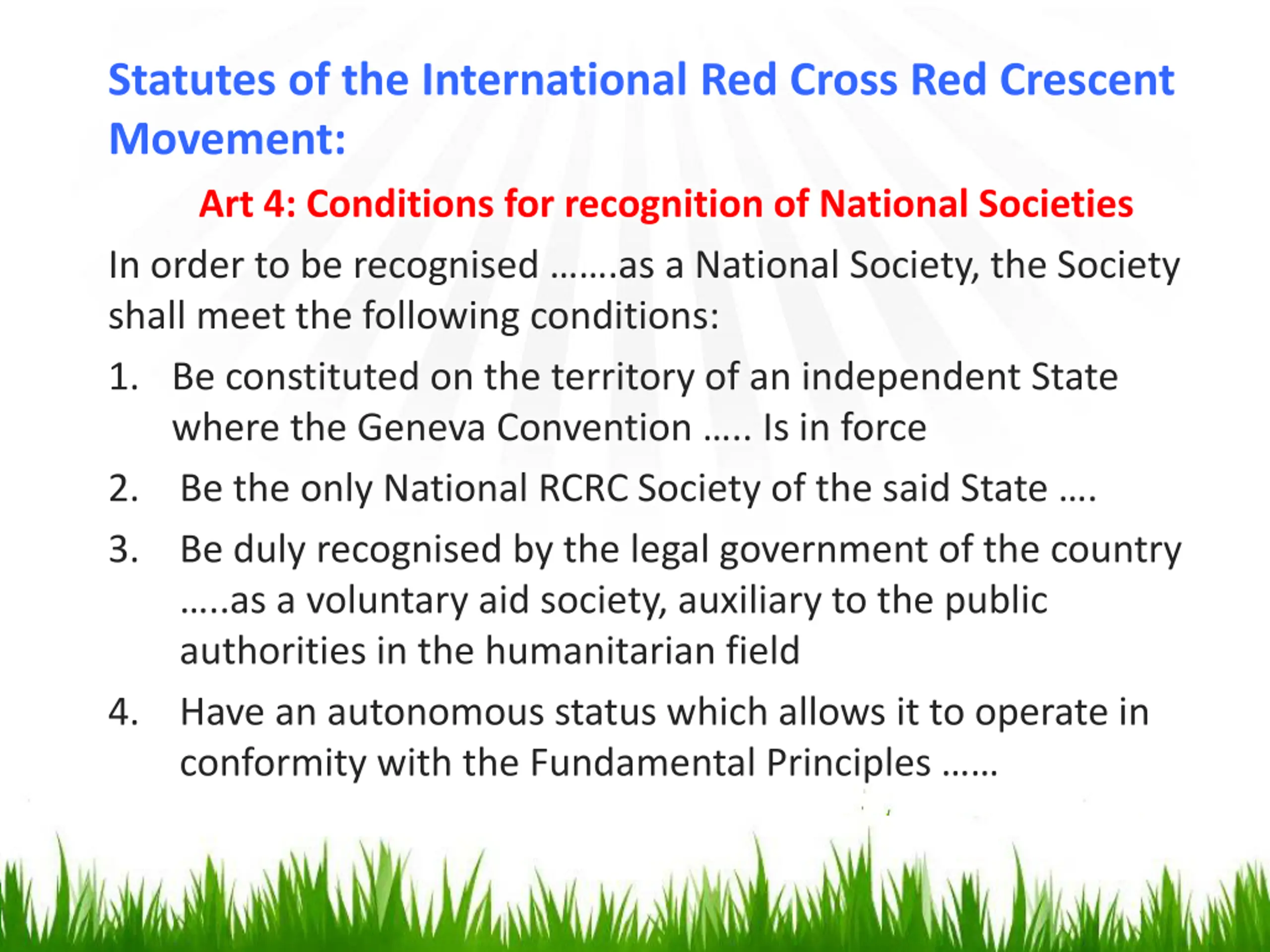 Statutes of the International Red Cross Red Crescent Movement: Art 4: Conditions for recognition of National Societies In order to be recognised .as a National Society, the Society shall meet the following conditions: 1. Be constituted on the territory of an independent State where the Geneva Convention .. Is in force 2. Be the only National RCRC Society of the said State . 3. Be duly recognised by the legal government of the country ..as a voluntary aid society, auxiliary to the public authorities in the humanitarian field 4. Have an autonomous status which allows it to operate in conformity with the Fundamental Principles