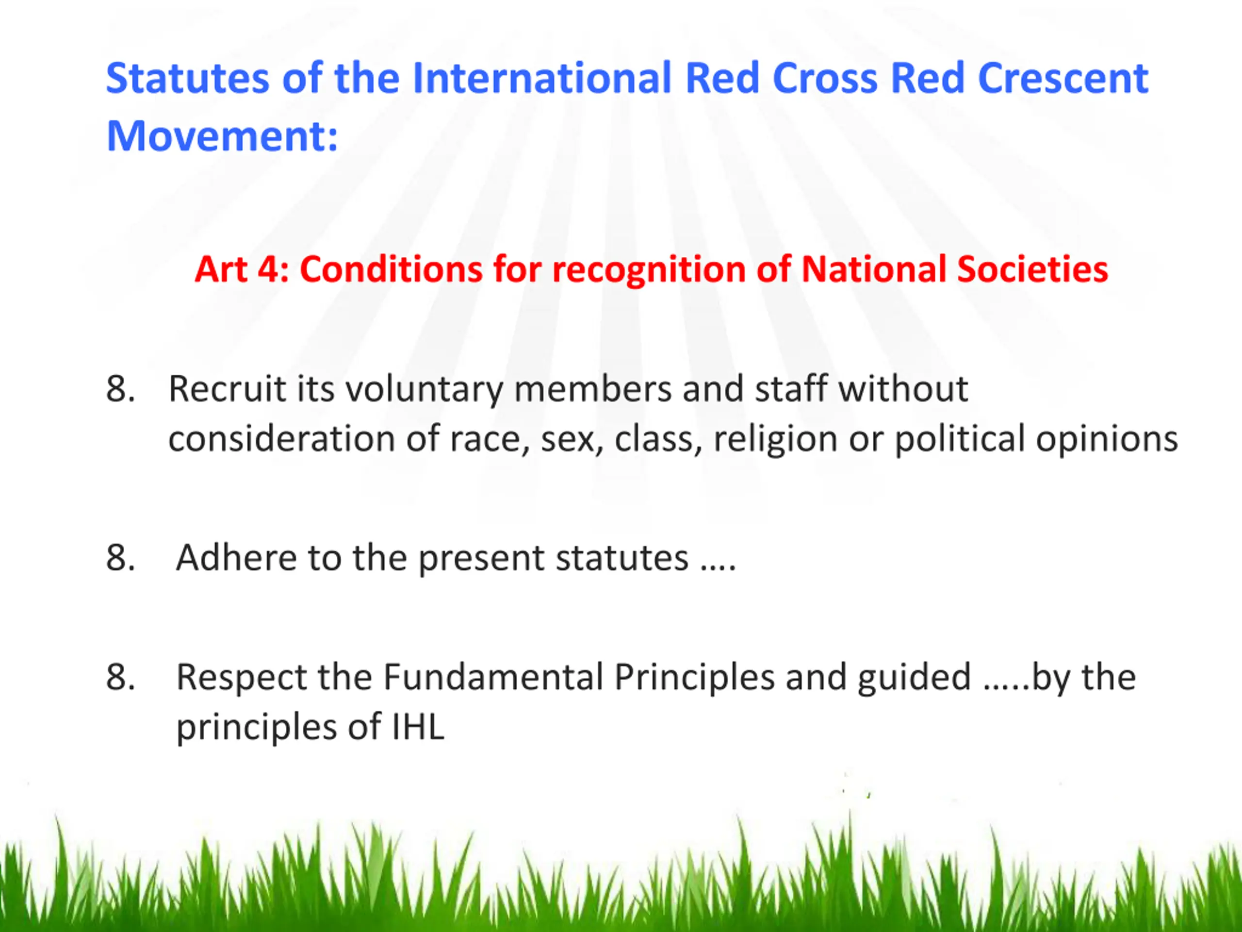 Statutes of the International Red Cross Red Crescent Movement: Art 4: Conditions for recognition of National Societies 8. Recruit its voluntary members and staff without consideration of race, sex, class, religion or political opinions 8. Adhere to the present statutes . 8. Respect the Fundamental Principles and guided ..by the principles of IHL