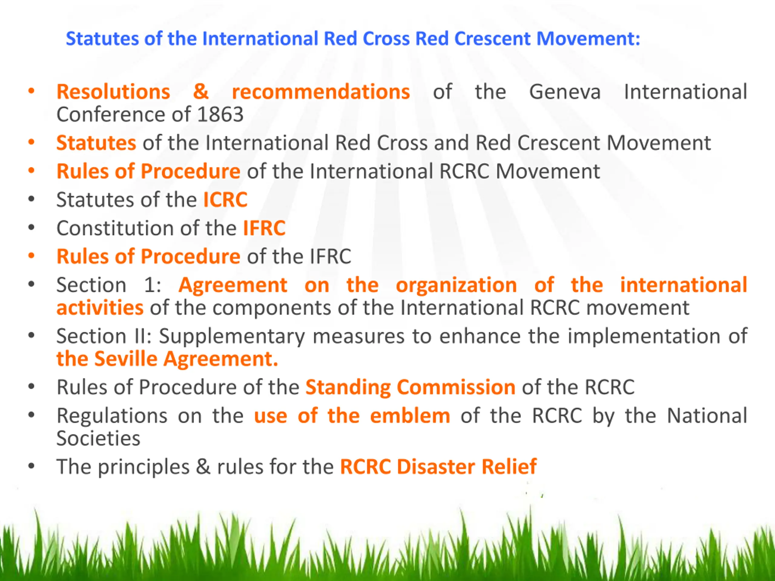 Statutes of the International Red Cross Red Crescent Movement: Resolutions & recommendations of the Geneva International Conference of 1863 Statutes of the International Red Cross and Red Crescent Movement Rules of Procedure of the International RCRC Movement Statutes of the ICRC Constitution of the IFRC Rules of Procedure of the IFRC Section 1: Agreement on the organization of the international activities of the components of the International RCRC movement Section II: Supplementary measures to enhance the implementation of the Seville Agreement. Rules of Procedure of the Standing Commission of the RCRC Regulations on the use of the emblem of the RCRC by the National Societies The principles & rules for the RCRC Disaster Relief