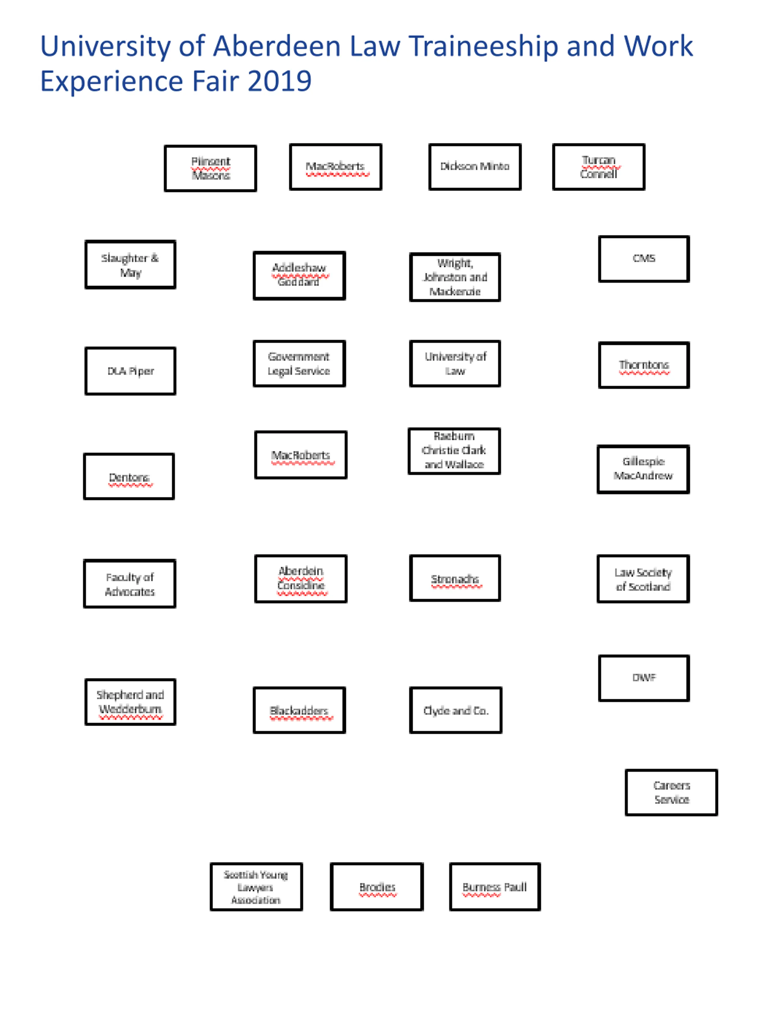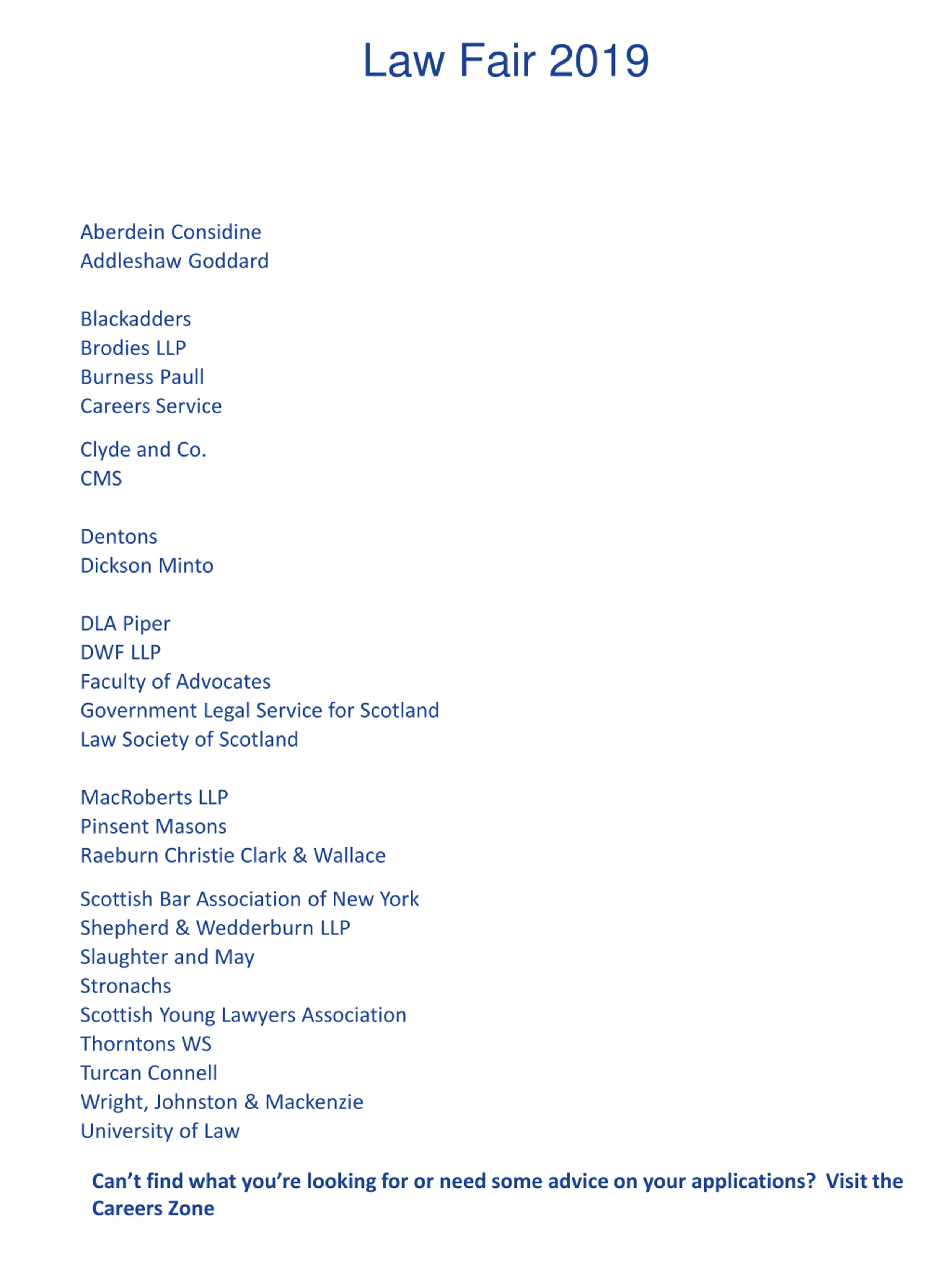 Law Fair 2019 Aberdein Considine Addleshaw Goddard Blackadders Brodies LLP Burness Paull Careers Service Clyde and Co. CMS Dentons Dickson Minto DLA Piper DWF LLP Faculty of Advocates Government Legal Service for Scotland Law Society of Scotland MacRoberts LLP Pinsent Masons Raeburn Christie Clark & Wallace Scottish Bar Association of New York Shepherd & Wedderburn LLP Slaughter and May Stronachs Scottish Young Lawyers Association Thorntons WS Turcan Connell Wright, Johnston & Mackenzie University of Law Can t find what you re looking for or need some advice on your applications? Visit the Careers Zone