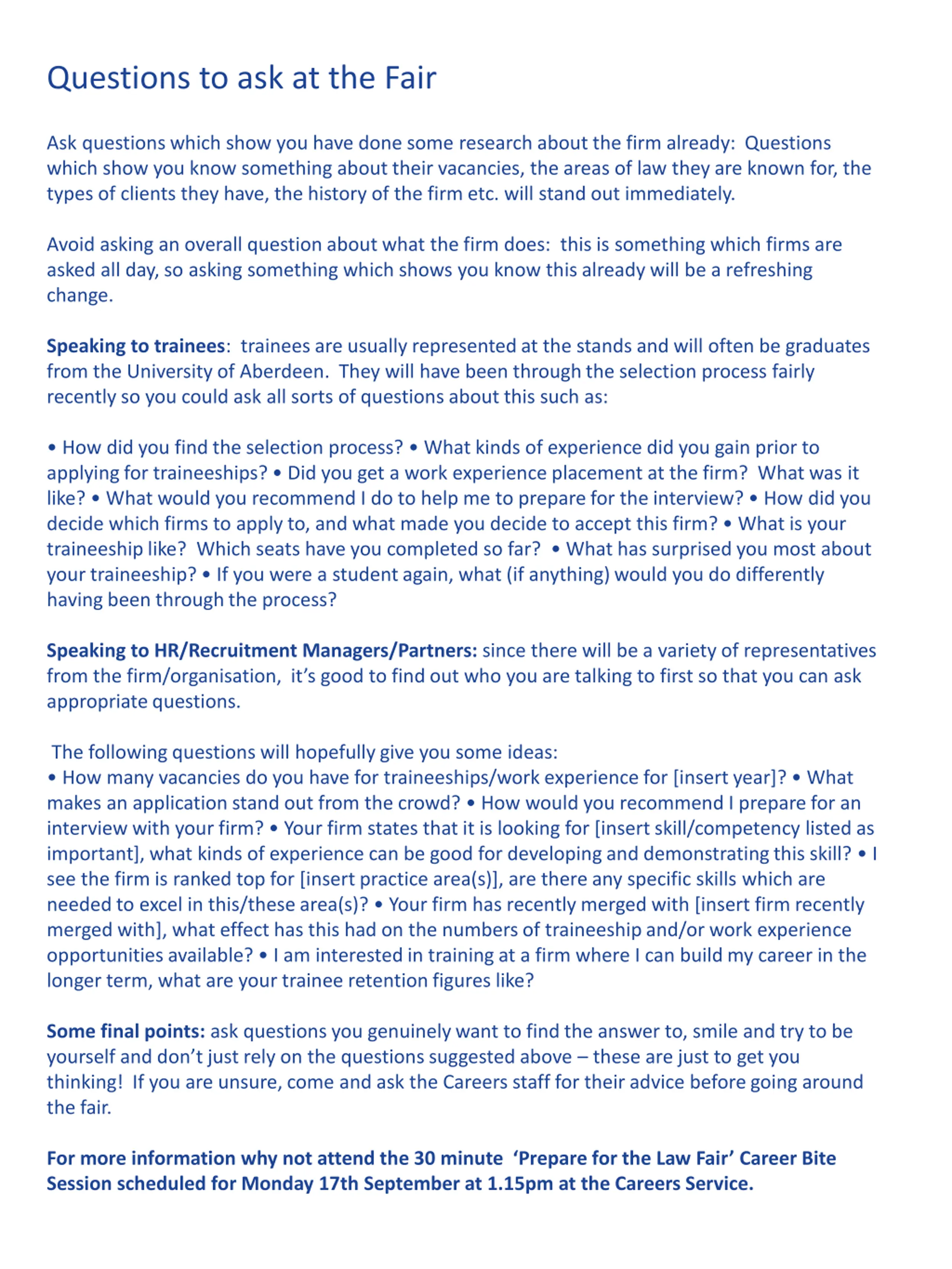 Questions to ask at the Fair Ask questions which show you have done some research about the firm already: Questions which show you know something about their vacancies, the areas of law they are known for, the types of clients they have, the history of the firm etc. will stand out immediately. Avoid asking an overall question about what the firm does: this is something which firms are asked all day, so asking something which shows you know this already will be a refreshing change. Speaking to trainees: trainees are usually represented at the stands and will often be graduates from the University of Aberdeen. They will have been through the selection process fairly recently so you could ask all sorts of questions about this such as: How did you find the selection process? What kinds of experience did you gain prior to applying for traineeships? Did you get a work experience placement at the firm? What was it like? What would you recommend I do to help me to prepare for the interview? How did you decide which firms to apply to, and what made you decide to accept this firm? What is your traineeship like? Which seats have you completed so far? What has surprised you most about your traineeship? If you were a student again, what (if anything) would you do differently having been through the process? Speaking to HR/Recruitment Managers/Partners: since there will be a variety of representatives from the firm/organisation, it s good to find out who you are talking to first so that you can ask appropriate questions. The following questions will hopefully give you some ideas: How many vacancies do you have for traineeships/work experience for [insert year]? What makes an application stand out from the crowd? How would you recommend I prepare for an interview with your firm? Your firm states that it is looking for [insert skill/competency listed as important], what kinds of experience can be good for developing and demonstrating this skill? I see the firm is ranked top for [insert practice area(s)], are there any specific skills which are needed to excel in this/these area(s)? Your firm has recently merged with [insert firm recently merged with], what effect has this had on the numbers of traineeship and/or work experience opportunities available? I am interested in training at a firm where I can build my career in the longer term, what are your trainee retention figures like? Some final points: ask questions you genuinely want to find the answer to, smile and try to be yourself and don t just rely on the questions suggested above these are just to get you thinking! If you are unsure, come and ask the Careers staff for their advice before going around the fair. For more information why not attend the 30 minute Prepare for the Law Fair Career Bite Session scheduled for Monday 17th September at 1.15pm at the Careers Service.