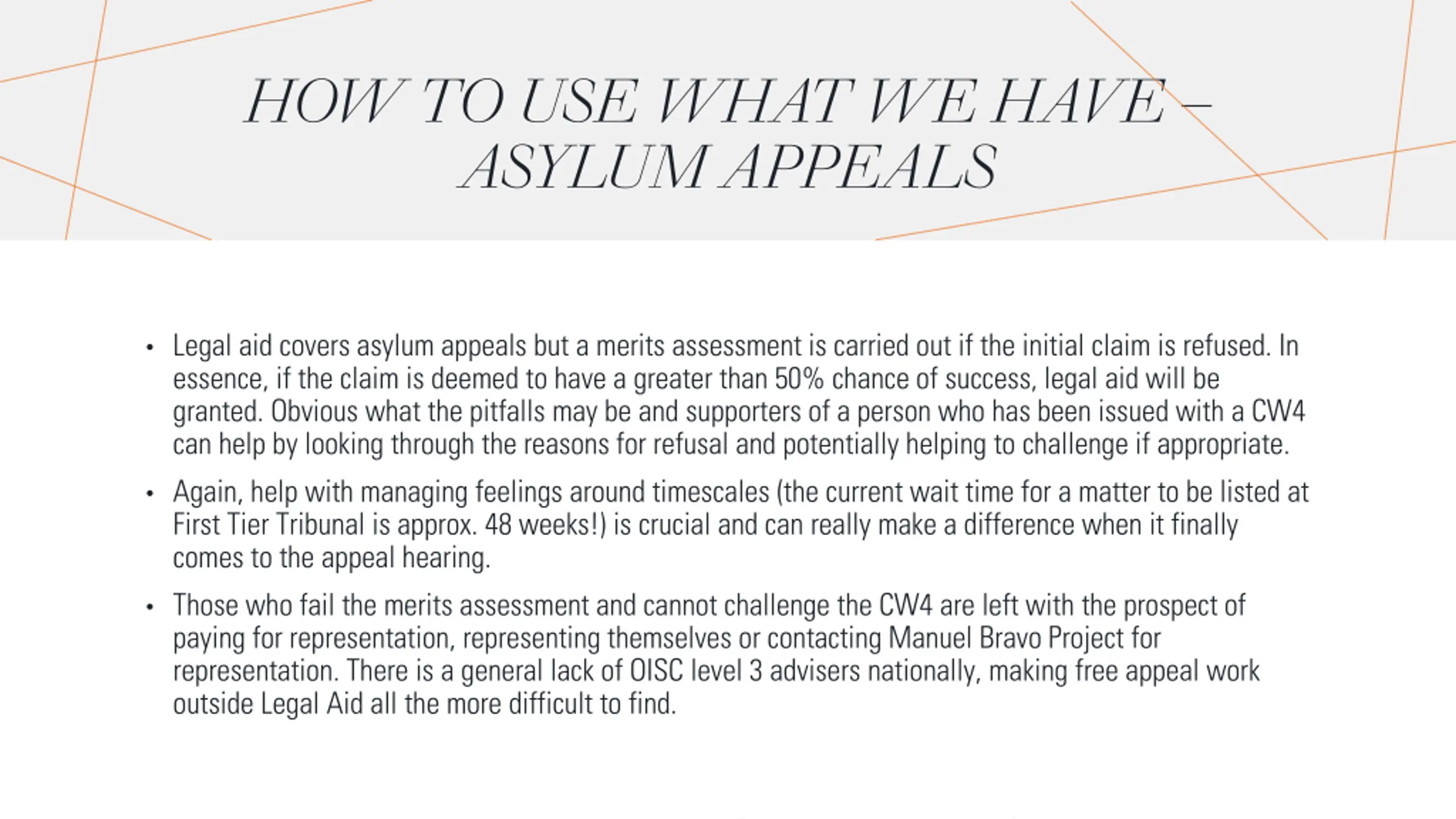 HOW TO USE WHAT WE HAVE ASYLUM APPEALS Legal aid covers asylum appeals but a merits assessment is carried out if the initial claim is refused. In essence, if the claim is deemed to have a greater than 50% chance of success, legal aid will be granted. Obvious what the pitfalls may be and supporters of a person who has been issued with a CW4 can help by looking through the reasons for refusal and potentially helping to challenge if appropriate. Again, help with managing feelings around timescales (the current wait time for a matter to be listed at First Tier Tribunal is approx. 48 weeks!) is crucial and can really make a difference when it finally comes to the appeal hearing. Those who fail the merits assessment and cannot challenge the CW4 are left with the prospect of paying for representation, representing themselves or contacting Manuel Bravo Project for representation. There is a general lack of OISC level 3 advisers nationally, making free appeal work outside Legal Aid all the more difficult to find.