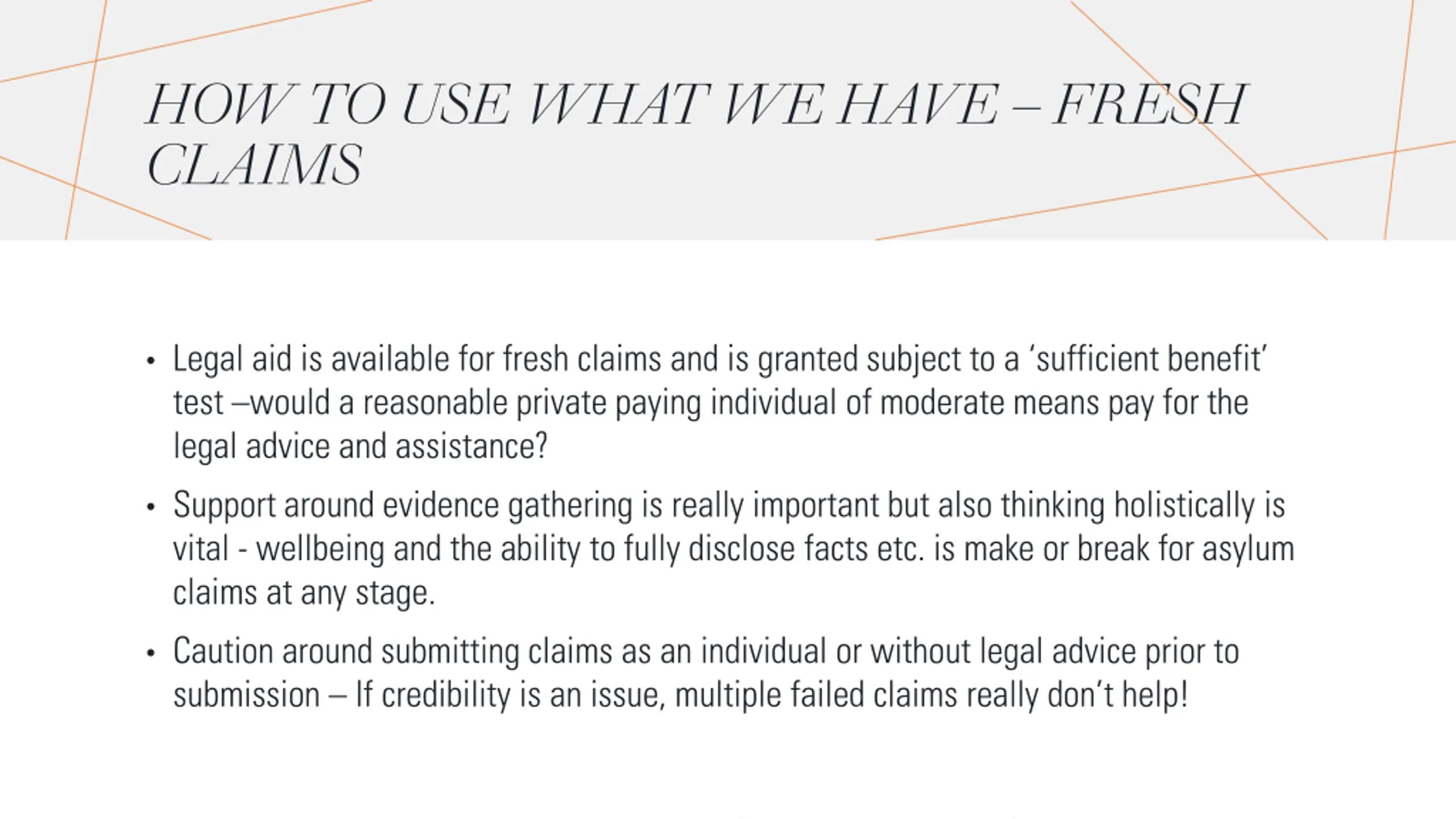HOW TO USE WHAT WE HAVE FRESH CLAIMS Legal aid is available for fresh claims and is granted subject to a sufficient benefit test would a reasonable private paying individual of moderate means pay for the legal advice and assistance? Support around evidence gathering is really important but also thinking holistically is vital - wellbeing and the ability to fully disclose facts etc. is make or break for asylum claims at any stage. Caution around submitting claims as an individual or without legal advice prior to submission If credibility is an issue, multiple failed claims really don t help!