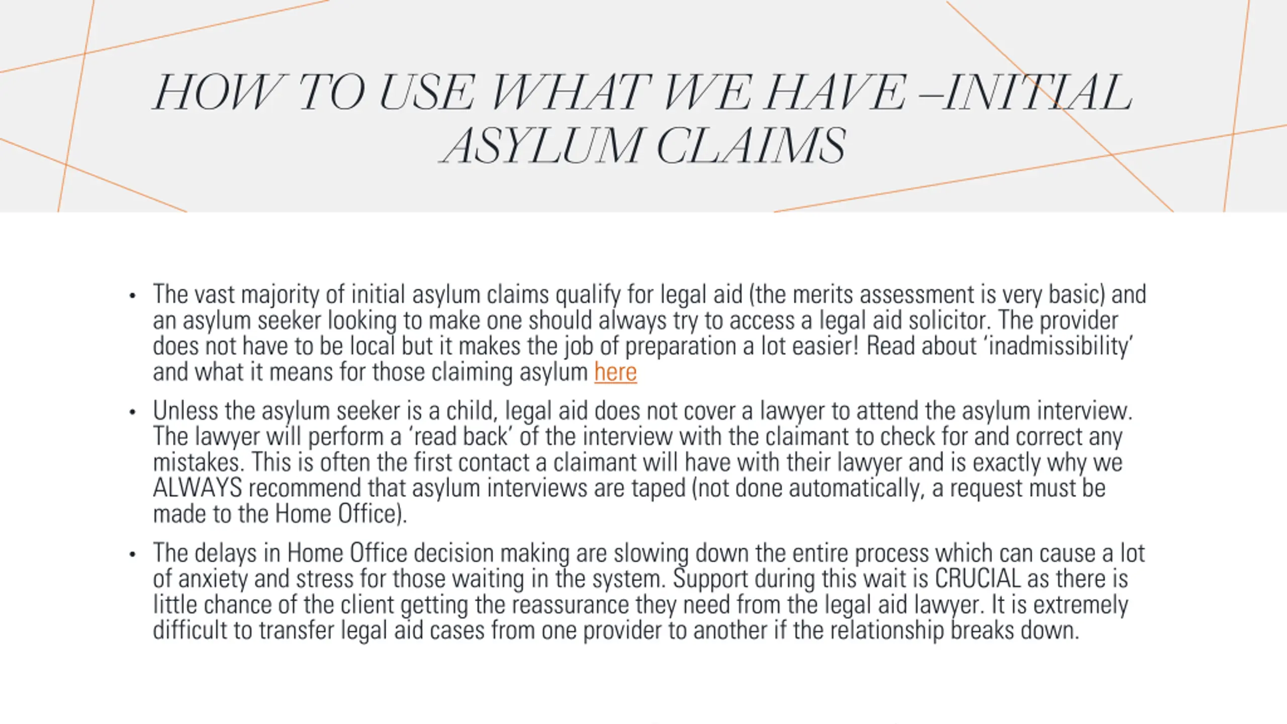 HOW TO USE WHAT WE HAVE INITIAL ASYLUM CLAIMS The vast majority of initial asylum claims qualify for legal aid (the merits assessment is very basic) and an asylum seeker looking to make one should always try to access a legal aid solicitor. The provider does not have to be local but it makes the job of preparation a lot easier! Read about inadmissibility and what it means for those claiming asylum here Unless the asylum seeker is a child, legal aid does not cover a lawyer to attend the asylum interview. The lawyer will perform a read back of the interview with the claimant to check for and correct any mistakes. This is often the first contact a claimant will have with their lawyer and is exactly why we ALWAYS recommend that asylum interviews are taped (not done automatically, a request must be made to the Home Office). The delays in Home Office decision making are slowing down the entire process which can cause a lot of anxiety and stress for those waiting in the system. Support during this wait is CRUCIAL as there is little chance of the client getting the reassurance they need from the legal aid lawyer. It is extremely difficult to transfer legal aid cases from one provider to another if the relationship breaks down.