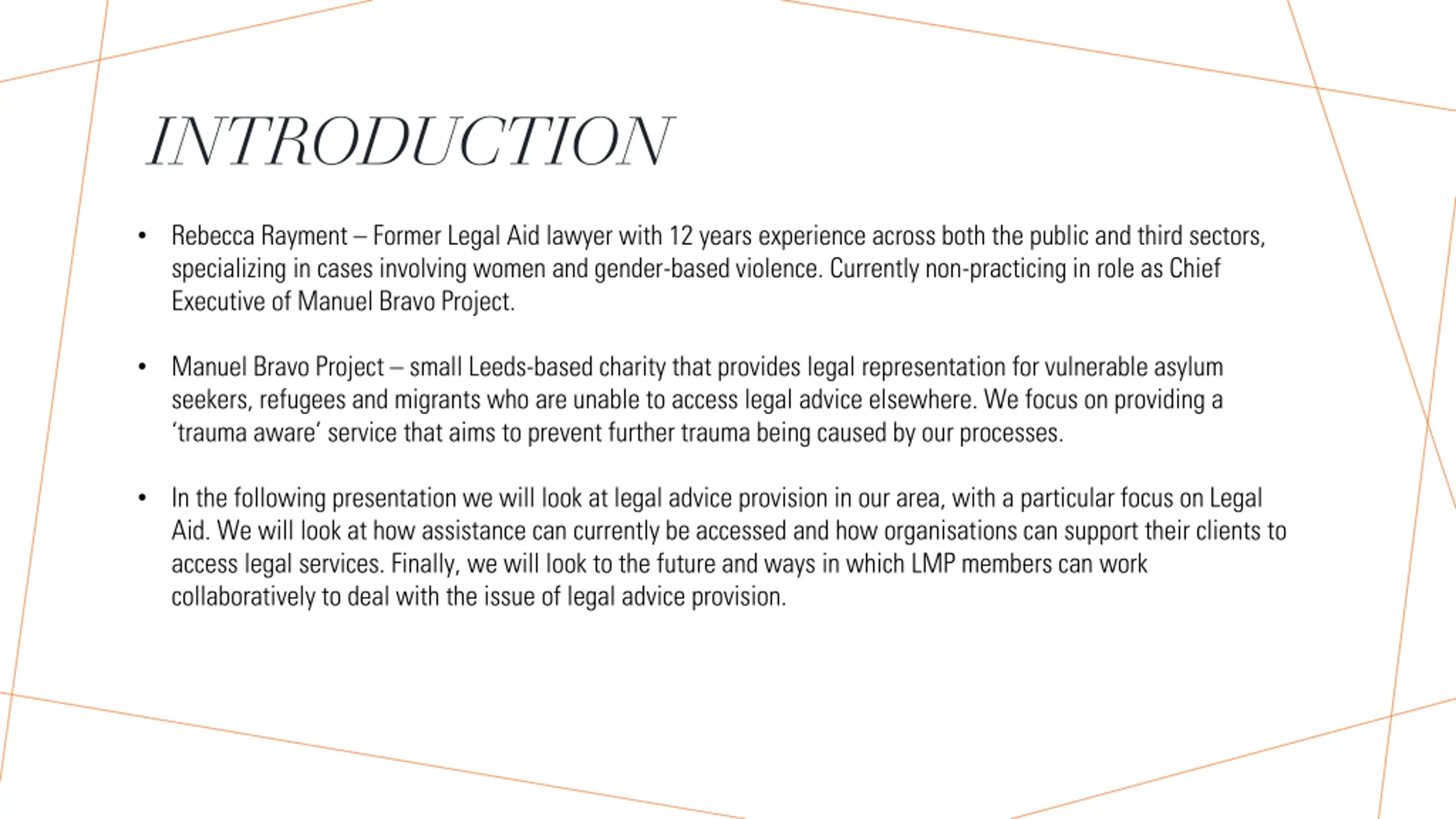 INTRODUCTION Rebecca Rayment Former Legal Aid lawyer with 12 years experience across both the public and third sectors, specializing in cases involving women and gender-based violence. Currently non-practicing in role as Chief Executive of Manuel Bravo Project. Manuel Bravo Project small Leeds-based charity that provides legal representation for vulnerable asylum seekers, refugees and migrants who are unable to access legal advice elsewhere. We focus on providing a trauma aware service that aims to prevent further trauma being caused by our processes. In the following presentation we will look at legal advice provision in our area, with a particular focus on Legal Aid. We will look at how assistance can currently be accessed and how organisations can support their clients to access legal services. Finally, we will look to the future and ways in which LMP members can work collaboratively to deal with the issue of legal advice provision.