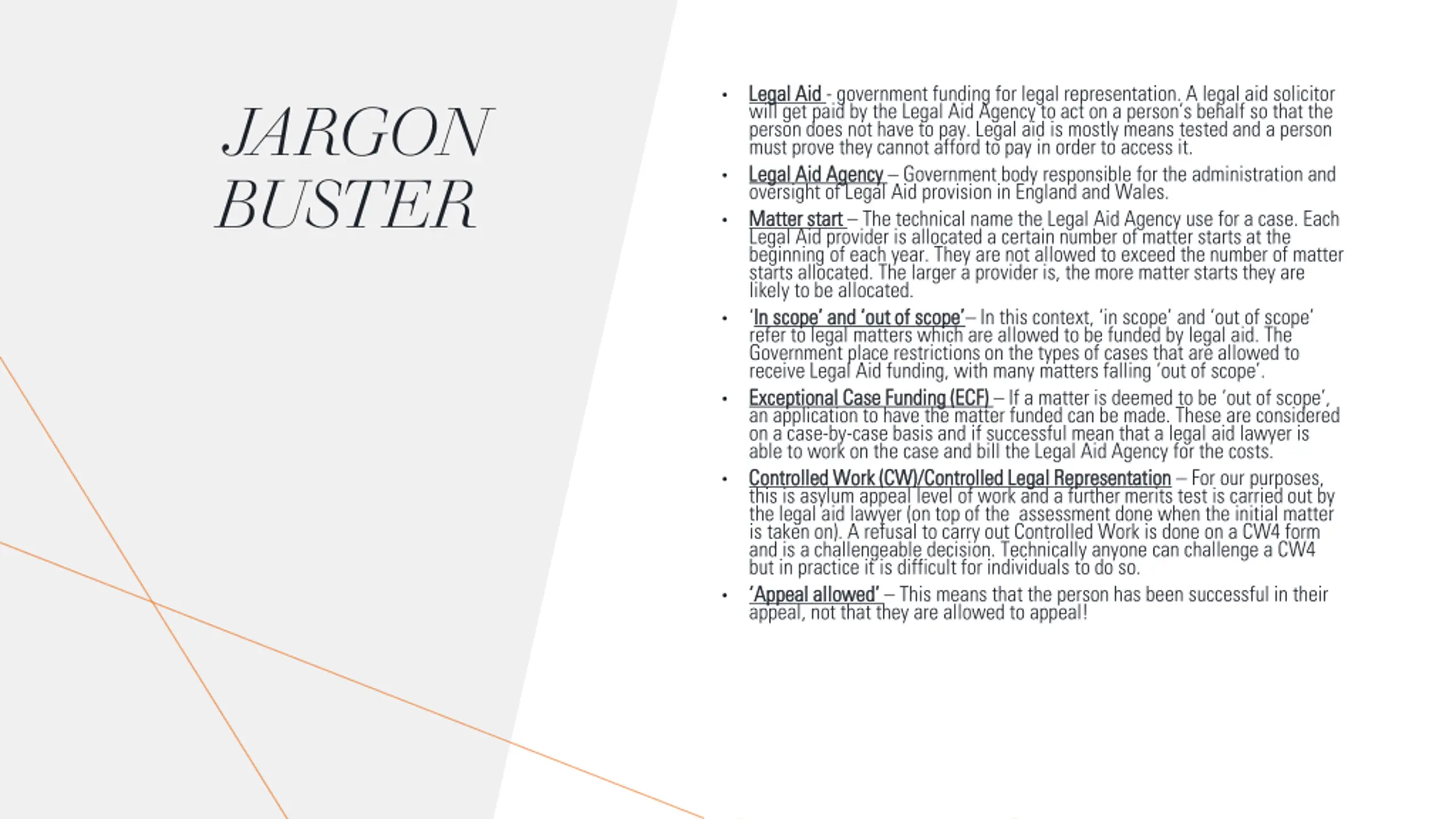 Legal Aid Legal Aid - government funding for legal representation. A legal aid solicitor will get paid by the Legal Aid Agency to act on a person s behalf so that the person does not have to pay. Legal aid is mostly means tested and a person must prove they cannot afford to pay in order to access it. Legal Aid Agency Legal Aid Agency Government body responsible for the administration and oversight of Legal Aid provision in England and Wales. Matter start Matter start The technical name the Legal Aid Agency use for a case. Each Legal Aid provider is allocated a certain number of matter starts at the beginning of each year. They are not allowed to exceed the number of matter starts allocated. The larger a provider is, the more matter starts they are likely to be allocated. In scope and out of scope In scope and out of scope In this context, in scope and out of scope refer to legal matters which are allowed to be funded by legal aid. The Government place restrictions on the types of cases that are allowed to receive Legal Aid funding, with many matters falling out of scope . Exceptional Case Funding (ECF) Exceptional Case Funding (ECF) If a matter is deemed to be out of scope , an application to have the matter funded can be made. These are considered on a case-by-case basis and if successful mean that a legal aid lawyer is able to work on the case and bill the Legal Aid Agency for the costs. Controlled Work (CW)/Controlled Legal Representation Controlled Work (CW)/Controlled Legal Representation For our purposes, this is asylum appeal level of work and a further merits test is carried out by the legal aid lawyer (on top of the assessment done when the initial matter is taken on). A refusal to carry out Controlled Work is done on a CW4 form and is a challengeable decision. Technically anyone can challenge a CW4 but in practice it is difficult for individuals to do so. Appeal allowed Appeal allowed This means that the person has been successful in their appeal, not that they are allowed to appeal! JARGON BUSTER