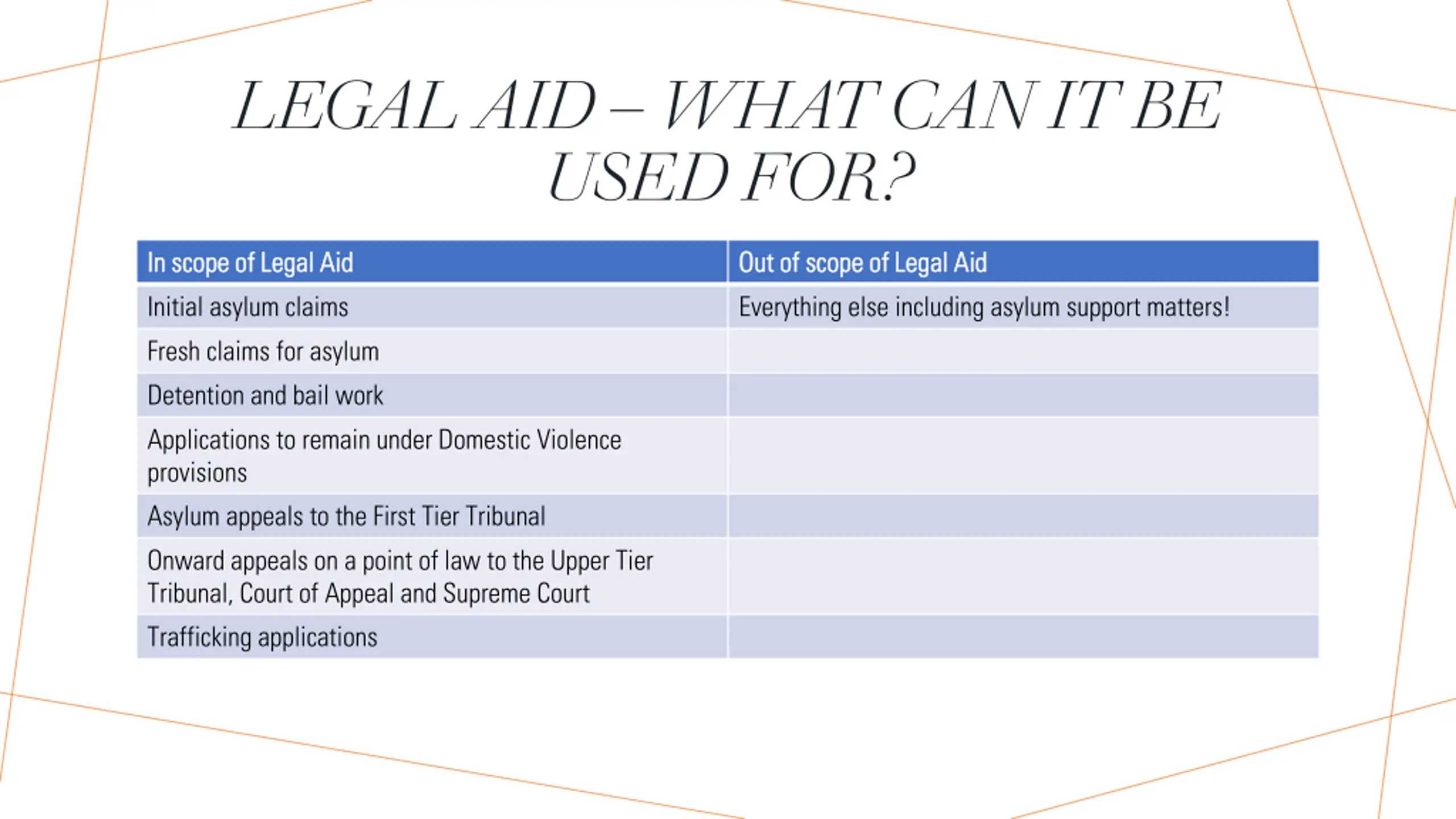 LEGAL AID WHAT CAN IT BE USED FOR? In scope of Legal Aid In scope of Legal Aid Initial asylum claims Fresh claims for asylum Detention and bail work Applications to remain under Domestic Violence provisions Asylum appeals to the First Tier Tribunal Onward appeals on a point of law to the Upper Tier Tribunal, Court of Appeal and Supreme Court Trafficking applications Out of scope of Legal Aid Out of scope of Legal Aid Everything else including asylum support matters!