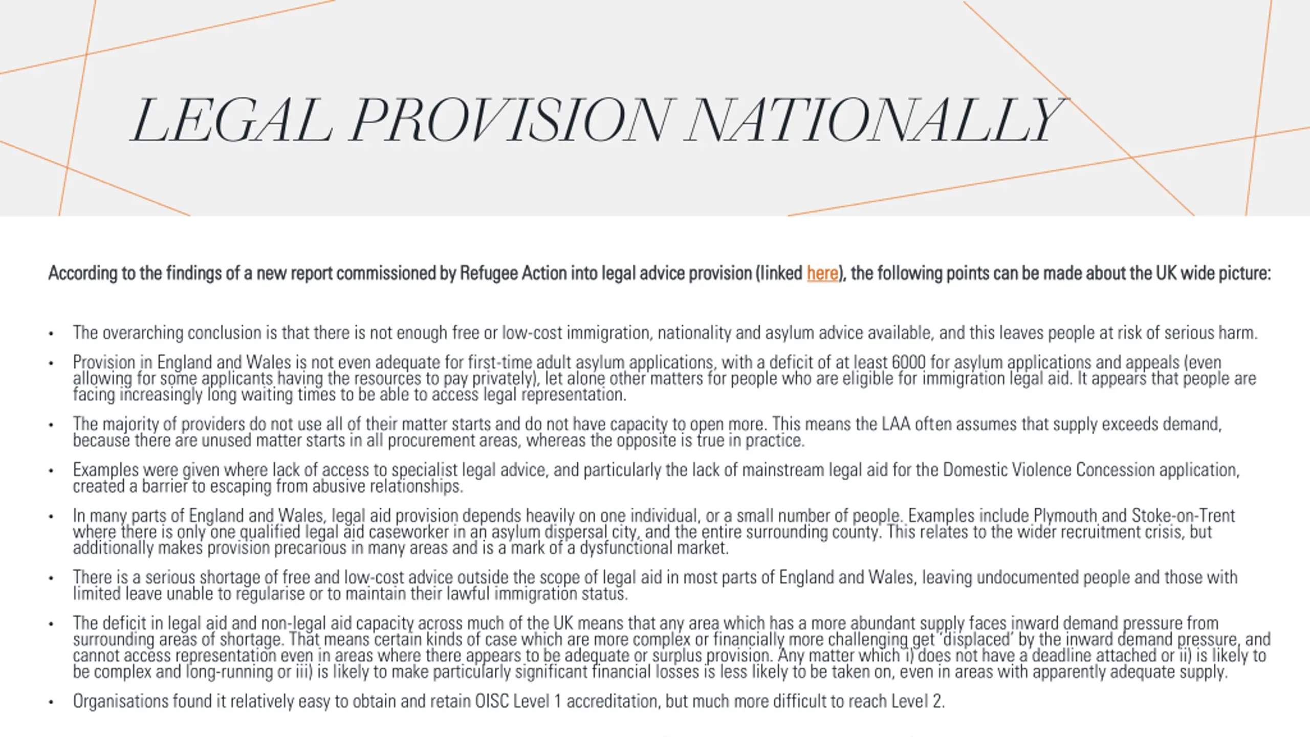LEGAL PROVISION NATIONALLY According to the findings of a new report commissioned by Refugee Action into legal advice provision (linked According to the findings of a new report commissioned by Refugee Action into legal advice provision (linked here here), the following points can be made about the UK wide picture: ), the following points can be made about the UK wide picture: The overarching conclusion is that there is not enough free or low-cost immigration, nationality and asylum advice available, and this leaves people at risk of serious harm. Provision in England and Wales is not even adequate for first-time adult asylum applications, with a deficit of at least 6000 for asylum applications and appeals (even allowing for some applicants having the resources to pay privately), let alone other matters for people who are eligible for immigration legal aid. It appears that people are facing increasingly long waiting times to be able to access legal representation. The majority of providers do not use all of their matter starts and do not have capacity to open more. This means the LAA often assumes that supply exceeds demand, because there are unused matter starts in all procurement areas, whereas the opposite is true in practice. Examples were given where lack of access to specialist legal advice, and particularly the lack of mainstream legal aid for the Domestic Violence Concession application, created a barrier to escaping from abusive relationships. In many parts of England and Wales, legal aid provision depends heavily on one individual, or a small number of people. Examples include Plymouth and Stoke-on-Trent where there is only one qualified legal aid caseworker in an asylum dispersal city, and the entire surrounding county. This relates to the wider recruitment crisis, but additionally makes provision precarious in many areas and is a mark of a dysfunctional market. There is a serious shortage of free and low-cost advice outside the scope of legal aid in most parts of England and Wales, leaving undocumented people and those with limited leave unable to regularise or to maintain their lawful immigration status. The deficit in legal aid and non-legal aid capacity across much of the UK means that any area which has a more abundant supply faces inward demand pressure from surrounding areas of shortage. That means certain kinds of case which are more complex or financially more challenging get displaced by the inward demand pressure, and cannot access representation even in areas where there appears to be adequate or surplus provision. Any matter which i) does not have a deadline attached or ii) is likely to be complex and long-running or iii) is likely to make particularly significant financial losses is less likely to be taken on, even in areas with apparently adequate supply. Organisations found it relatively easy to obtain and retain OISC Level 1 accreditation, but much more difficult to reach Level 2.
