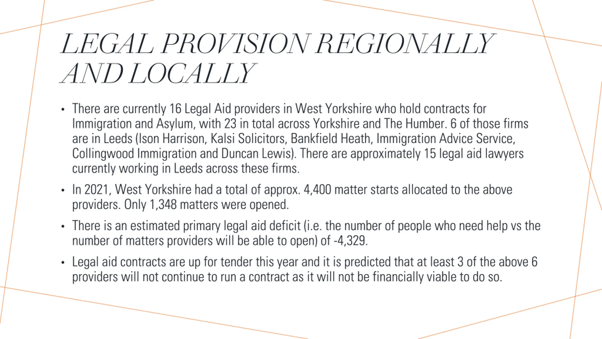 LEGAL PROVISION REGIONALLY AND LOCALLY There are currently 16 Legal Aid providers in West Yorkshire who hold contracts for Immigration and Asylum, with 23 in total across Yorkshire and The Humber. 6 of those firms are in Leeds (Ison Harrison, Kalsi Solicitors, Bankfield Heath, Immigration Advice Service, Collingwood Immigration and Duncan Lewis). There are approximately 15 legal aid lawyers currently working in Leeds across these firms. In 2021, West Yorkshire had a total of approx. 4,400 matter starts allocated to the above providers. Only 1,348 matters were opened. There is an estimated primary legal aid deficit (i.e. the number of people who need help vs the number of matters providers will be able to open) of -4,329. Legal aid contracts are up for tender this year and it is predicted that at least 3 of the above 6 providers will not continue to run a contract as it will not be financially viable to do so.