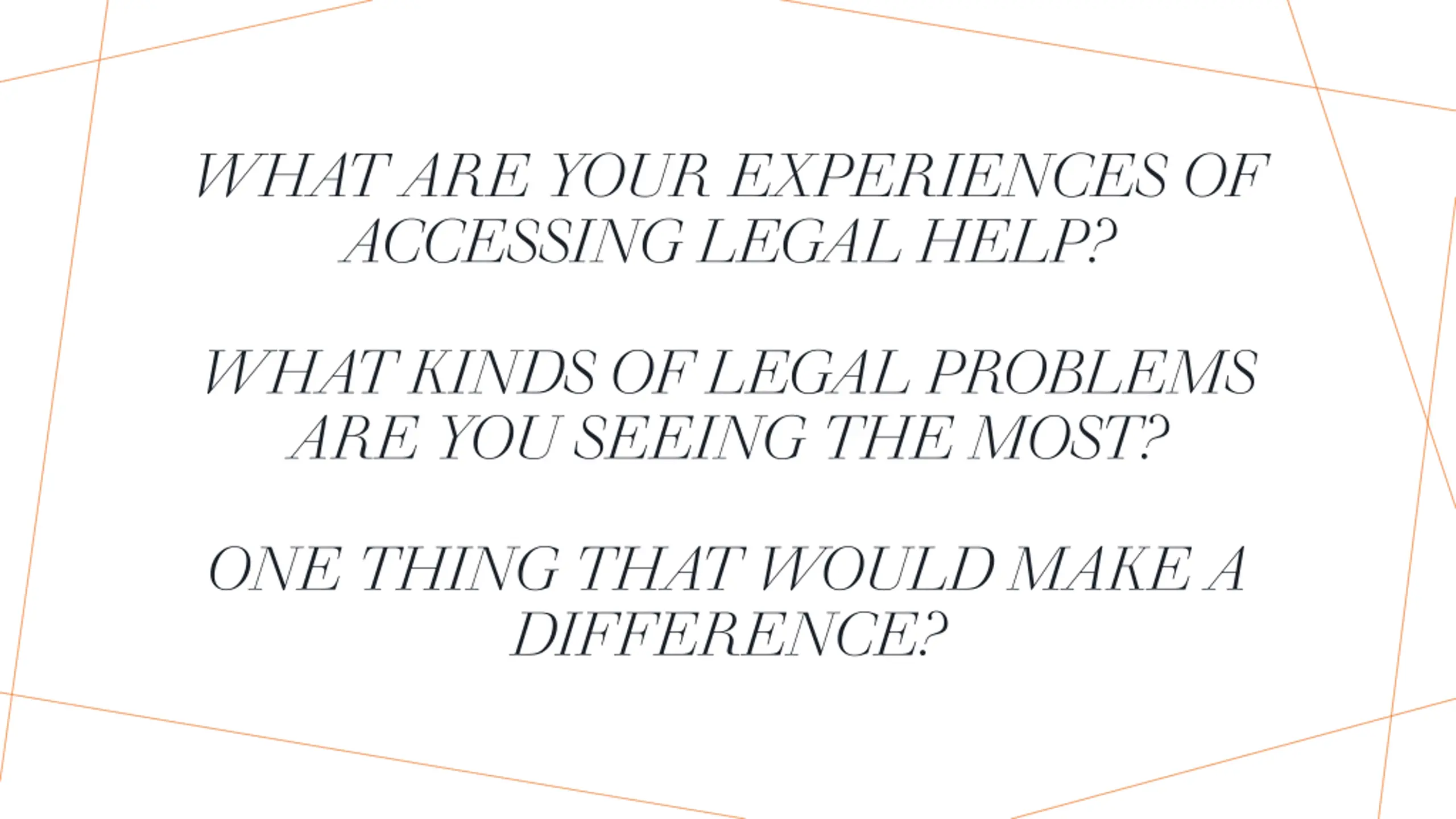WHAT ARE YOUR EXPERIENCES OF ACCESSING LEGAL HELP? WHAT KINDS OF LEGAL PROBLEMS ARE YOU SEEING THE MOST? ONE THING THAT WOULD MAKE A DIFFERENCE?