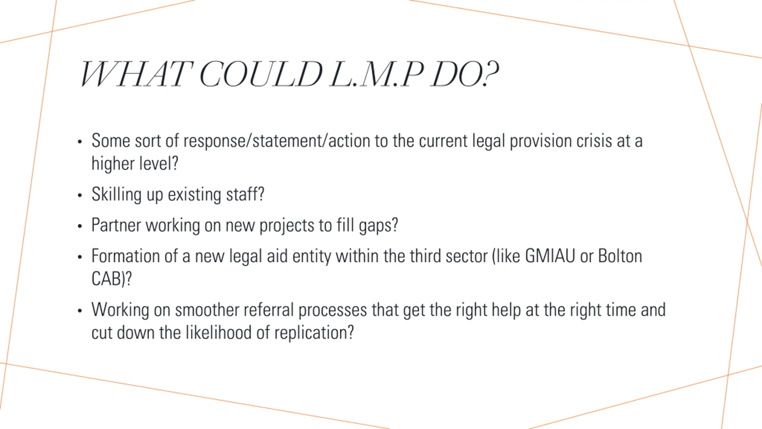 WHAT COULD L.M.P DO? Some sort of response/statement/action to the current legal provision crisis at a higher level? Skilling up existing staff? Partner working on new projects to fill gaps? Formation of a new legal aid entity within the third sector (like GMIAU or Bolton CAB)? Working on smoother referral processes that get the right help at the right time and cut down the likelihood of replication?