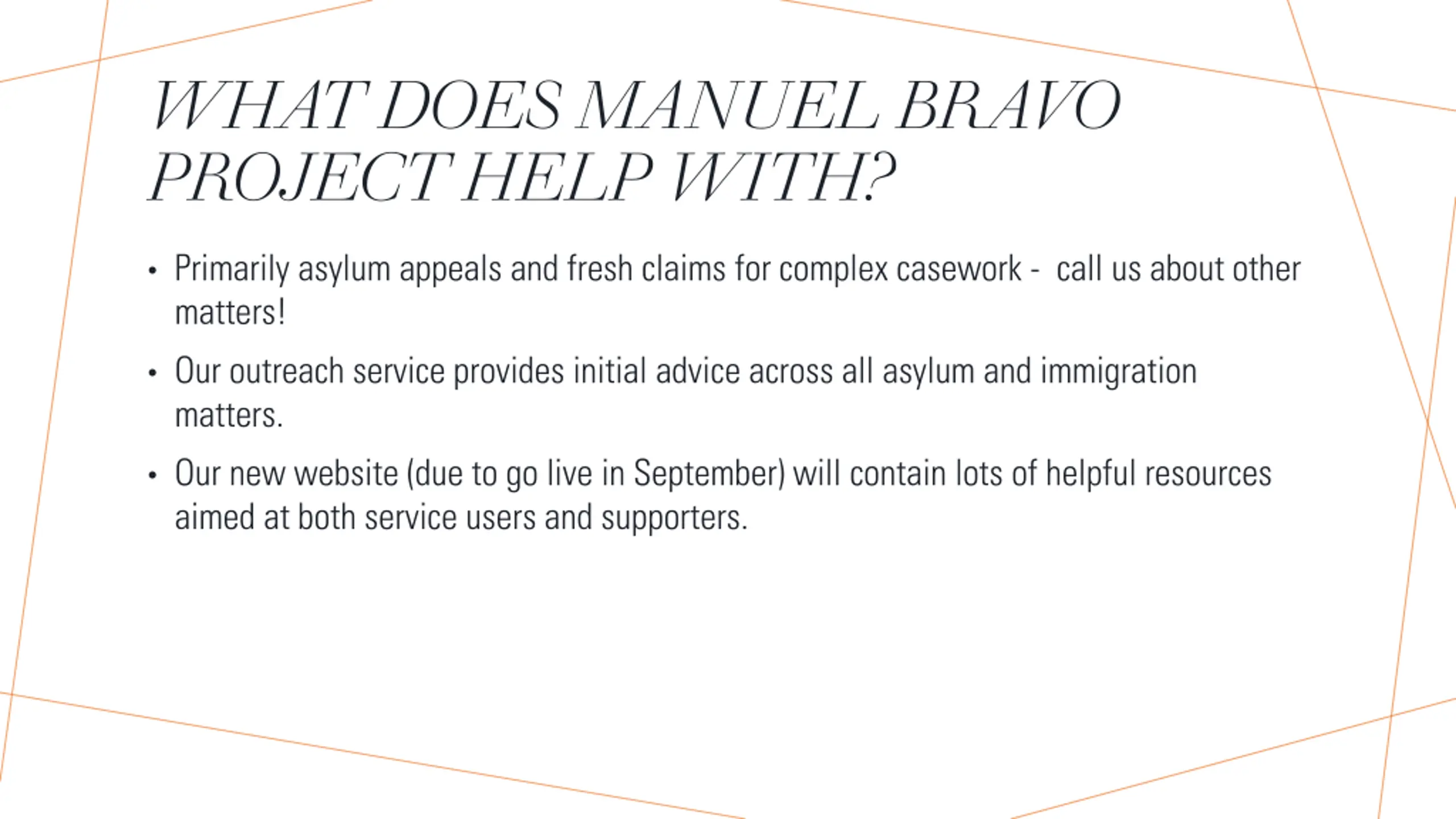 WHAT DOES MANUEL BRAVO PROJECT HELP WITH? Primarily asylum appeals and fresh claims for complex casework - call us about other matters! Our outreach service provides initial advice across all asylum and immigration matters. Our new website (due to go live in September) will contain lots of helpful resources aimed at both service users and supporters.