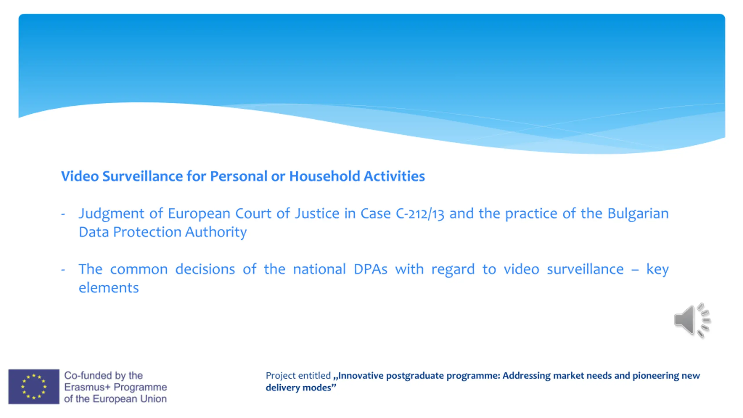Video Surveillance for Personal or Household Activities - Judgment of European Court of Justice in Case C-212/13 and the practice of the Bulgarian Data Protection Authority - The common decisions of the national DPAs with regard to video surveillance key elements Project entitled Innovative postgraduate programme: Addressing market needs and pioneering new delivery modes