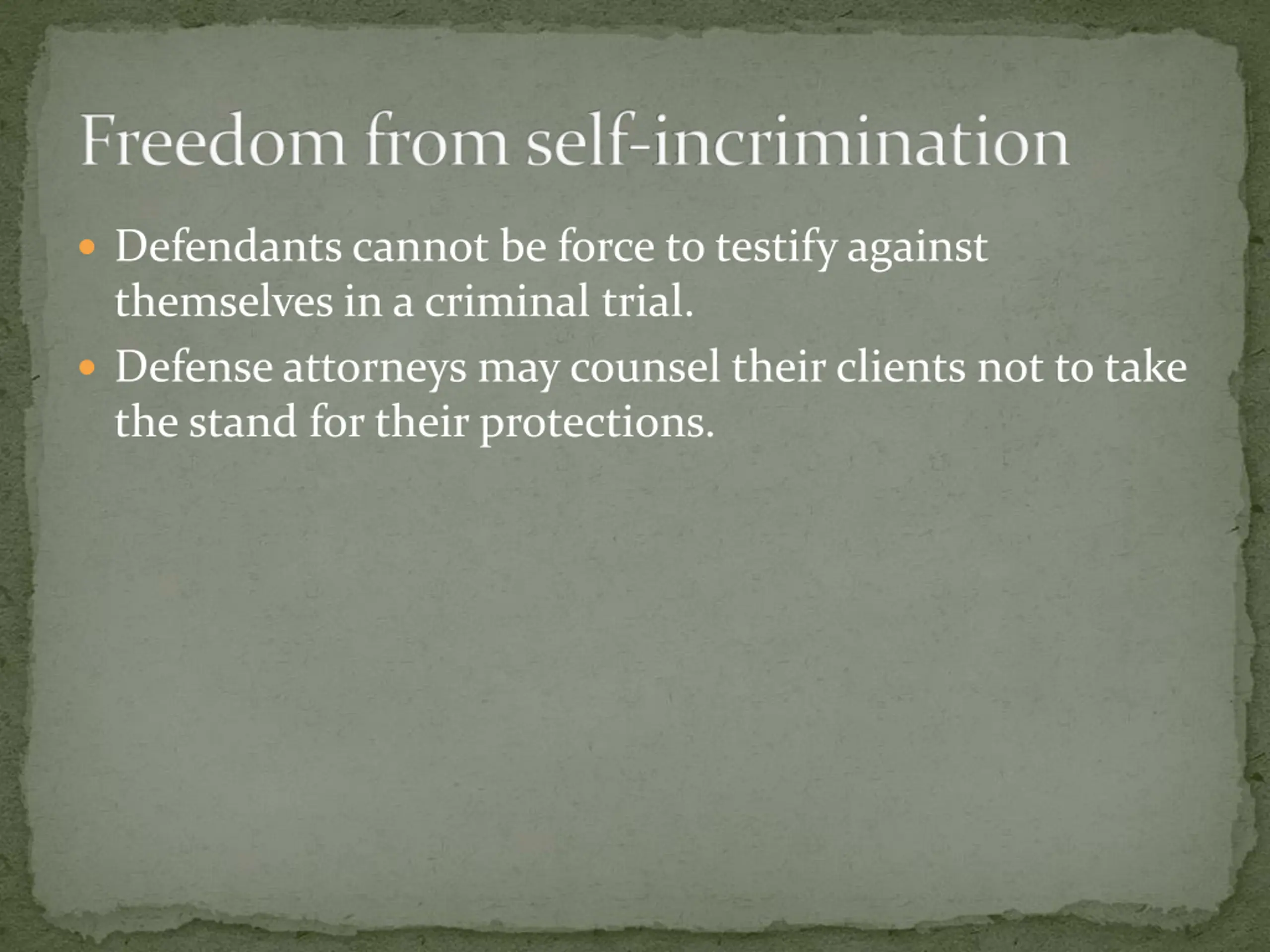 Freedom from self-incrimination Defendants cannot be force to testify against themselves in a criminal trial. Defense attorneys may counsel their clients not to take the stand for their protections.