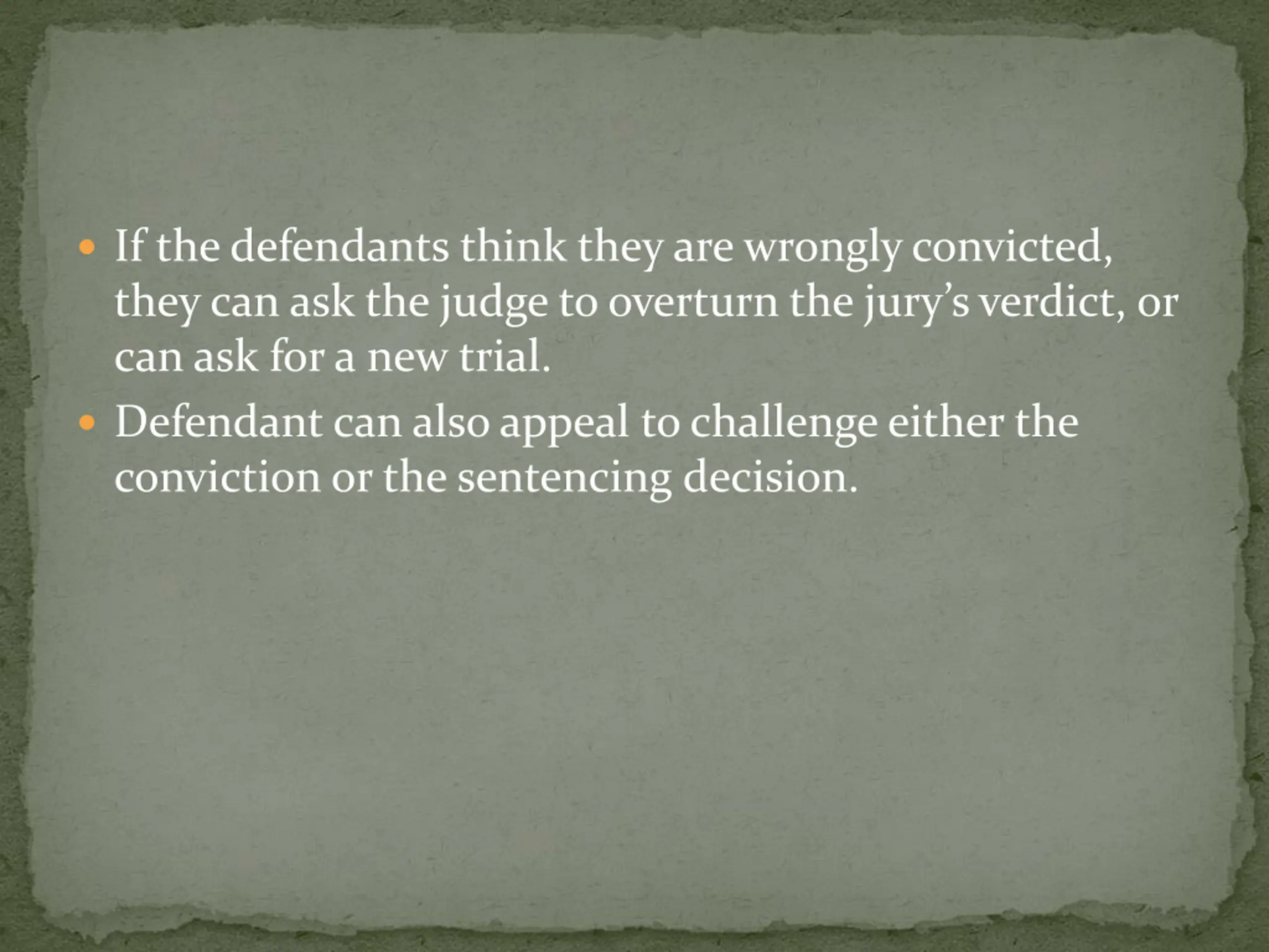 If the defendants think they are wrongly convicted, they can ask the judge to overturn the jury s verdict, or can ask for a new trial. Defendant can also appeal to challenge either the conviction or the sentencing decision.